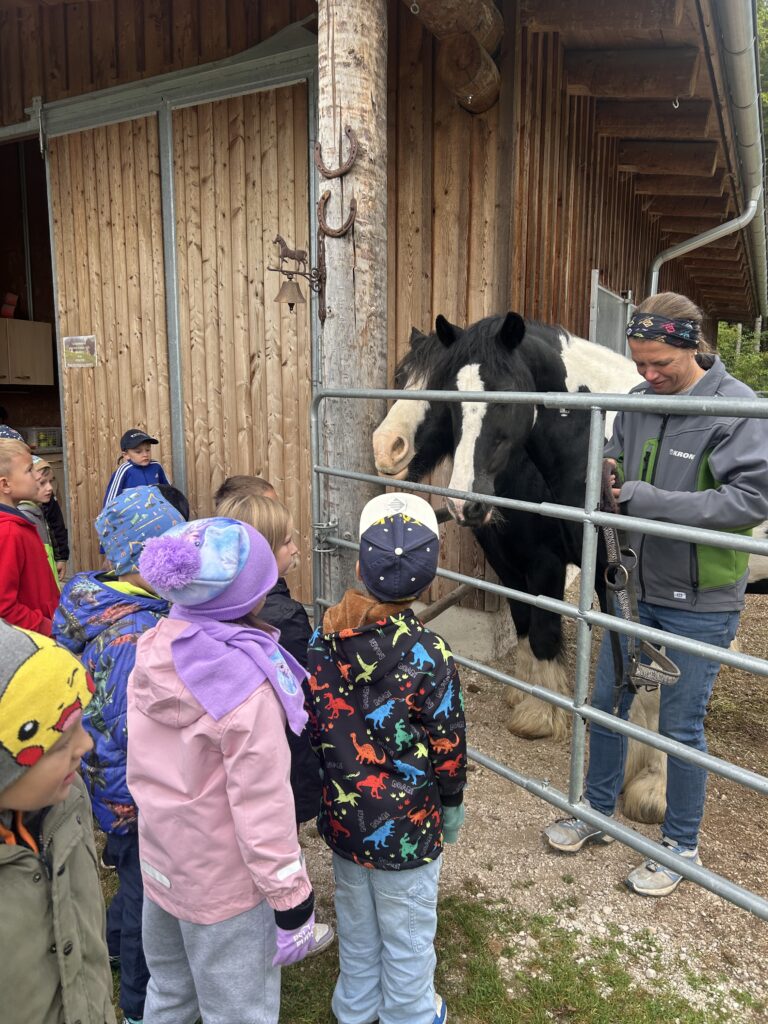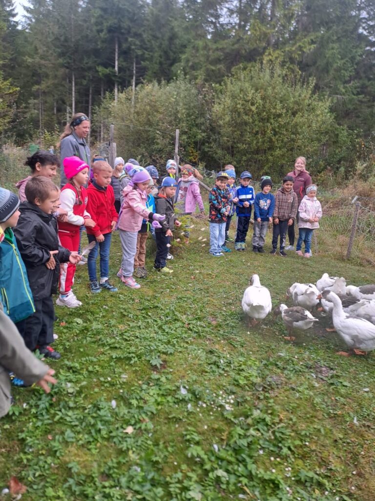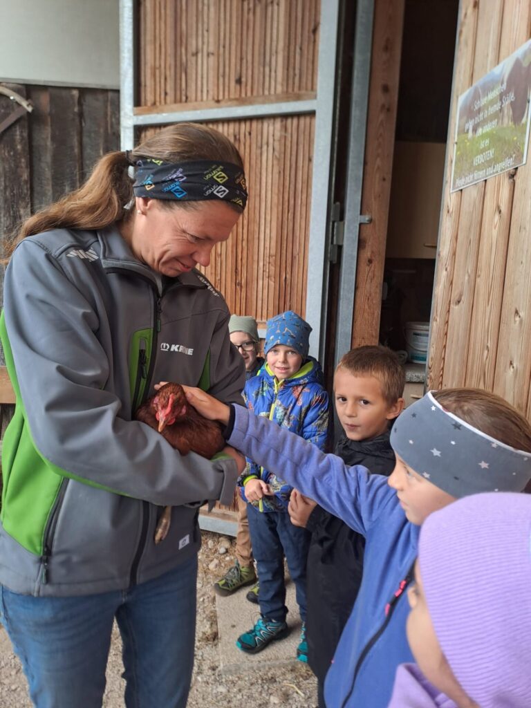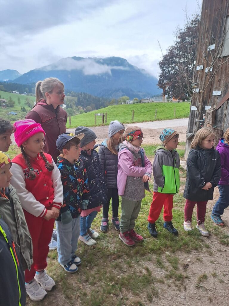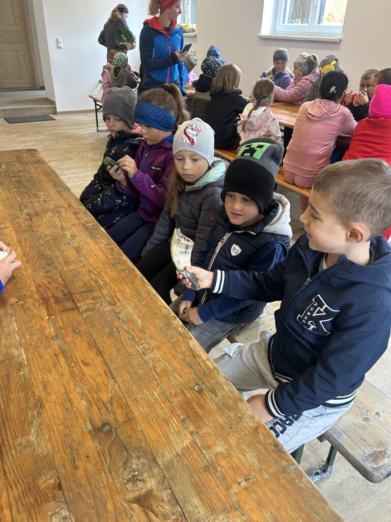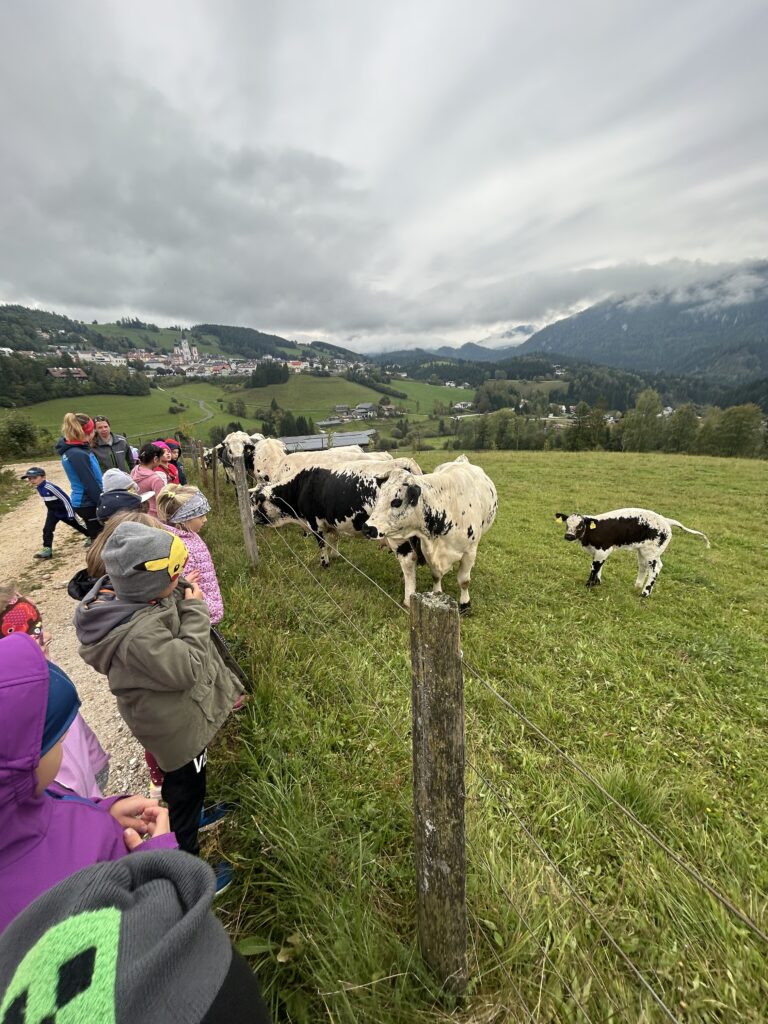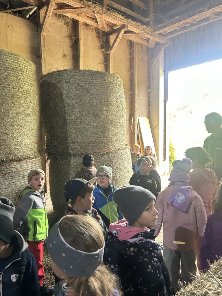 Gleich zu Beginn wurden die Kinder über den Hof geführt und lernten einige Tiere kennen. Dabei begegneten sie Gänsen, Pferden, Ziegen, Hühnern und noch vielen weiteren Tieren. Besonders interessant war es, die Kühe und ihre Kälber – die „Kaiberl“ – zu beobachten. Ein tolles Erlebnis war außerdem, dass einige Tiere sogar selbst gefüttert und gestreichelt werden durften.