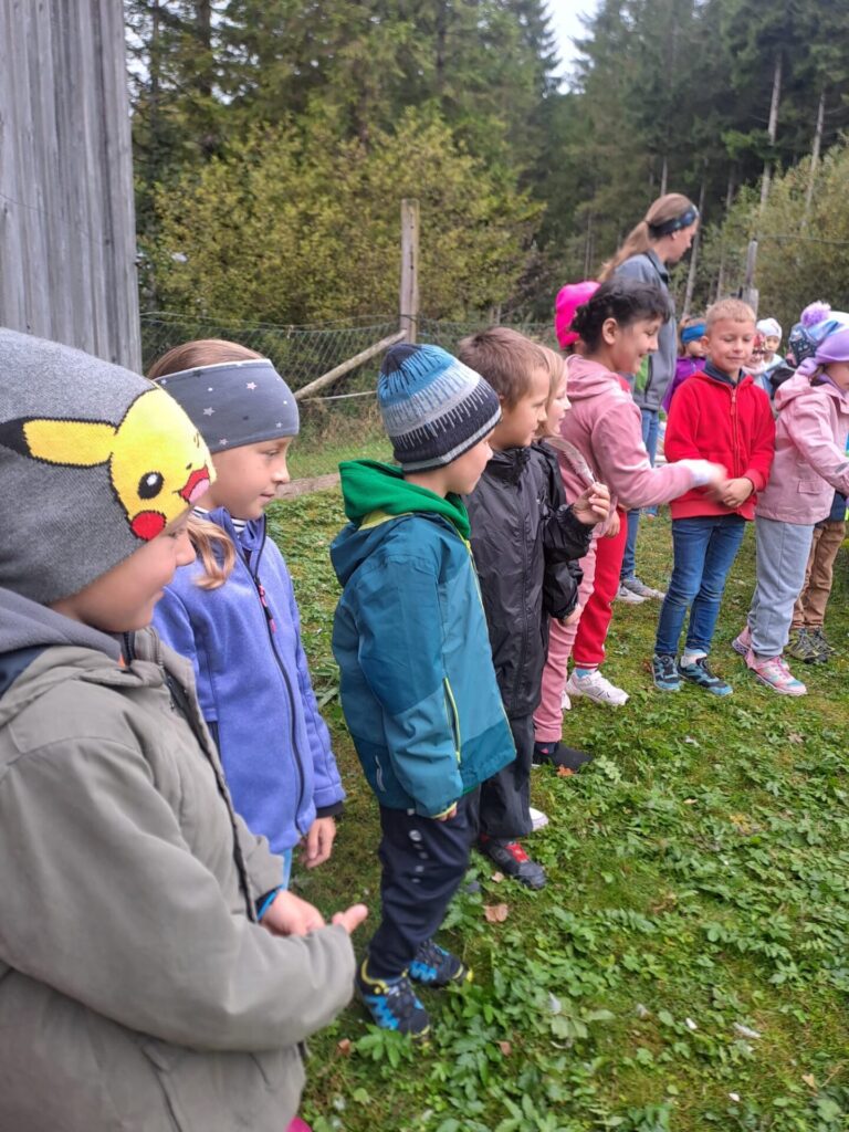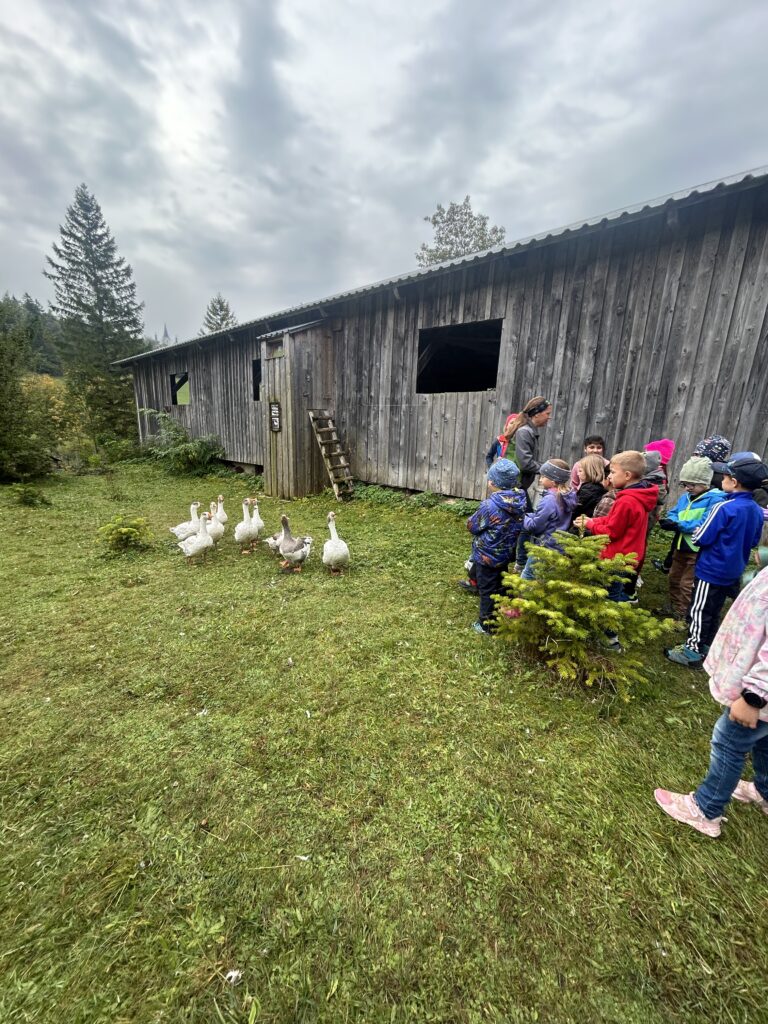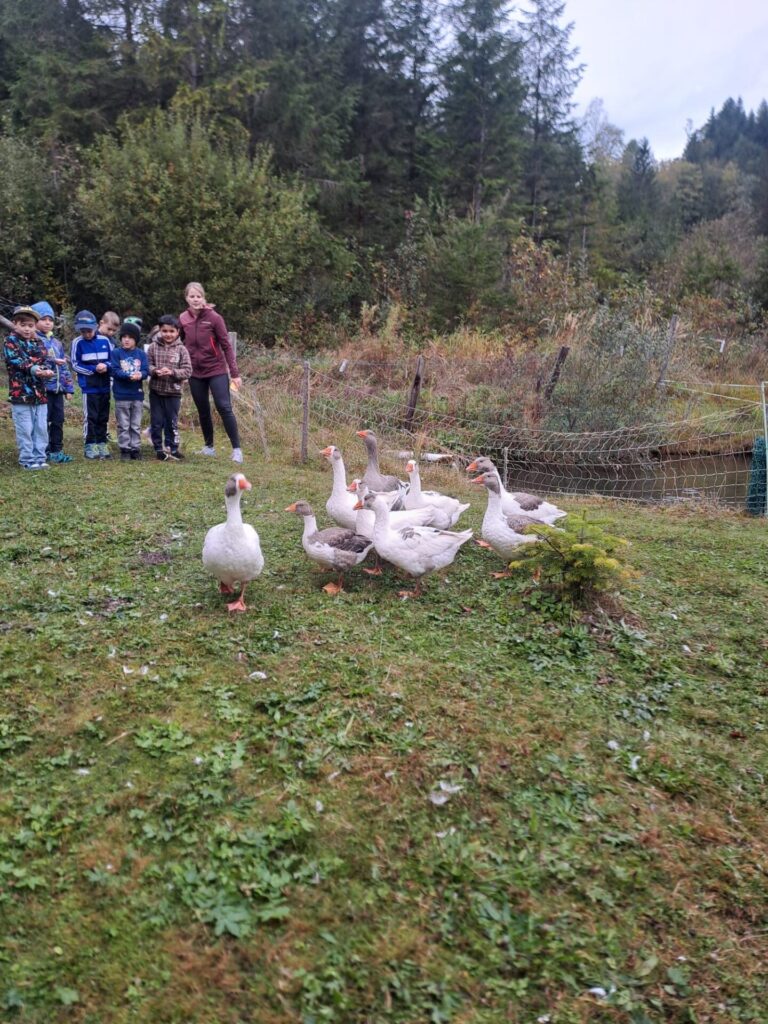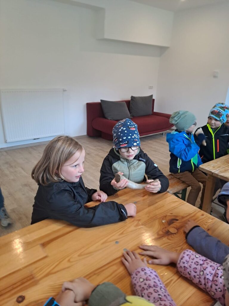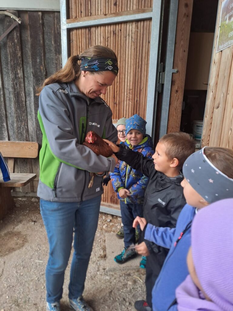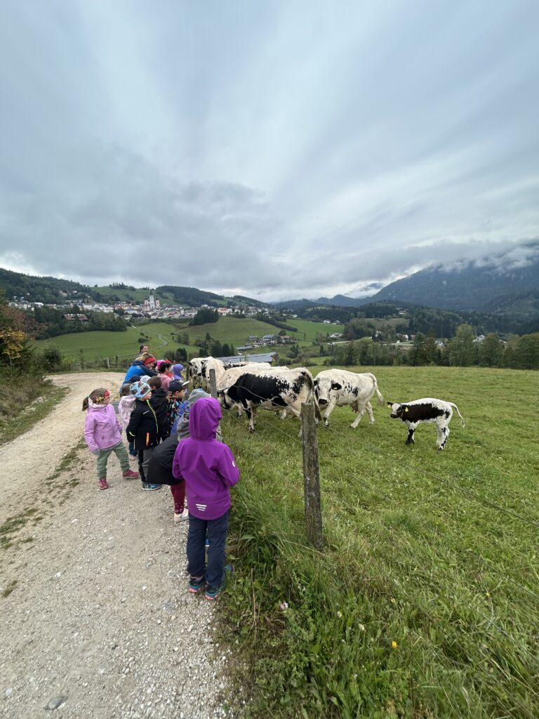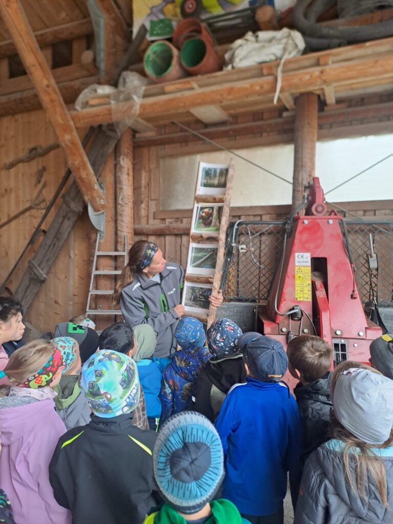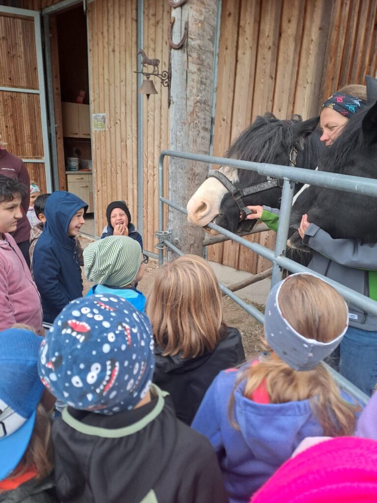 Gleich zu Beginn wurden die Kinder über den Hof geführt und lernten einige Tiere kennen. Dabei begegneten sie Gänsen, Pferden, Ziegen, Hühnern und noch vielen weiteren Tieren. Besonders interessant war es, die Kühe und ihre Kälber – die „Kaiberl“ – zu beobachten. Ein tolles Erlebnis war außerdem, dass einige Tiere sogar selbst gefüttert und gestreichelt werden durften.