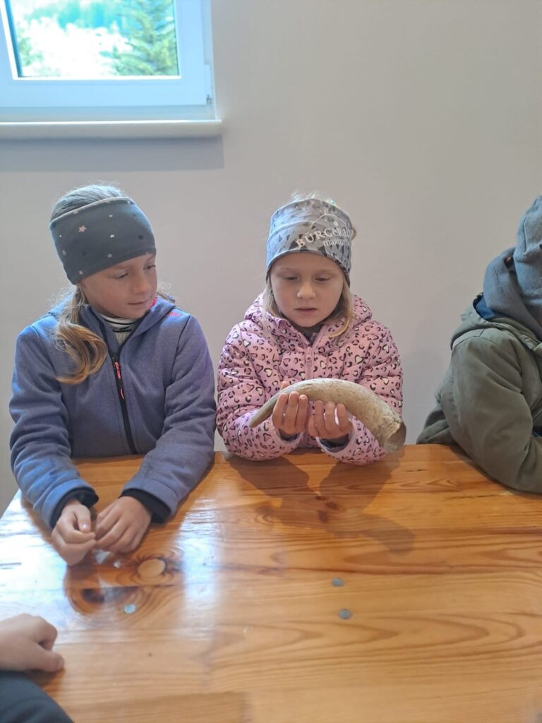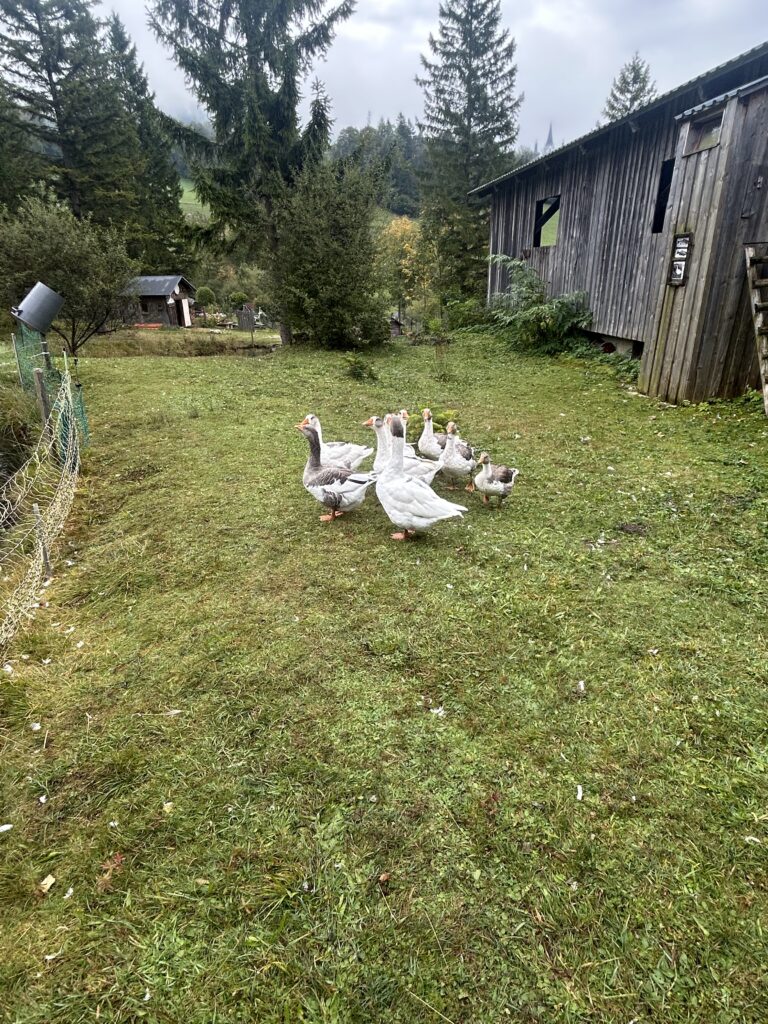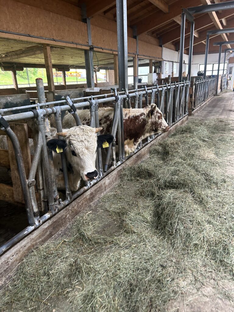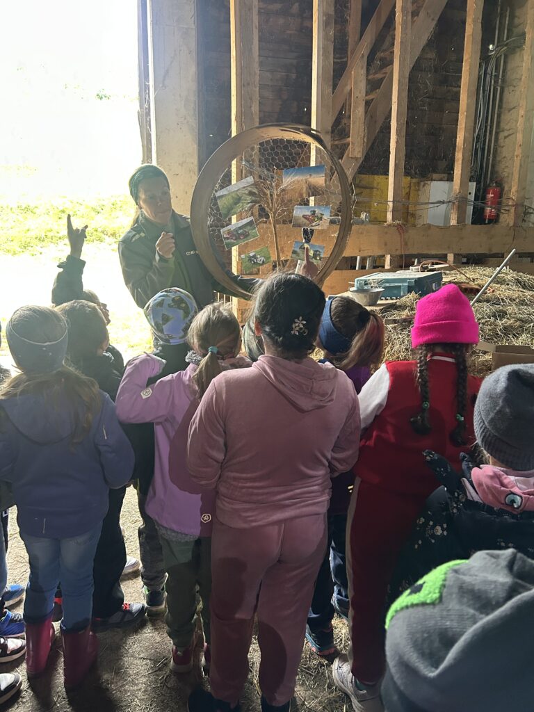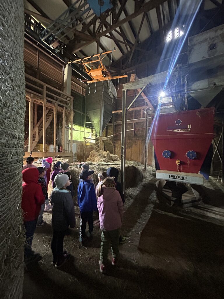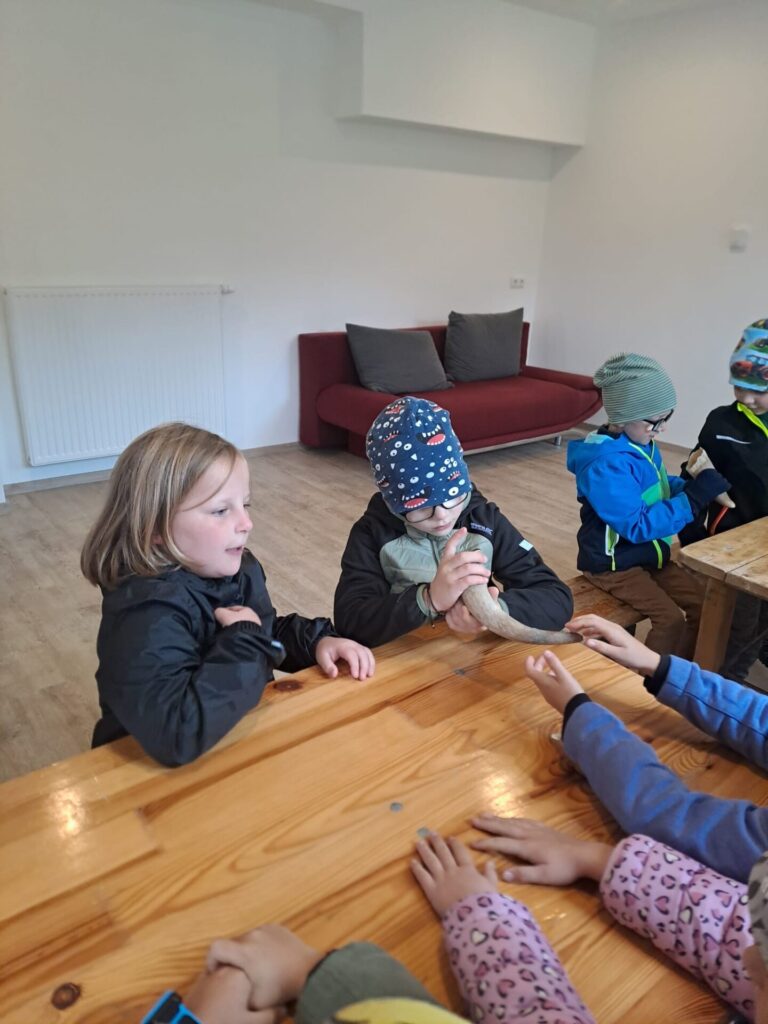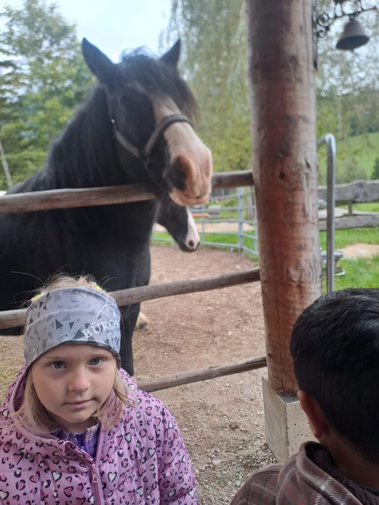Gleich zu Beginn wurden die Kinder über den Hof geführt und lernten einige Tiere kennen. Dabei begegneten sie Gänsen, Pferden, Ziegen, Hühnern und noch vielen weiteren Tieren. Besonders interessant war es, die Kühe und ihre Kälber – die „Kaiberl“ – zu beobachten. Ein tolles Erlebnis war außerdem, dass einige Tiere sogar selbst gefüttert und gestreichelt werden durften.