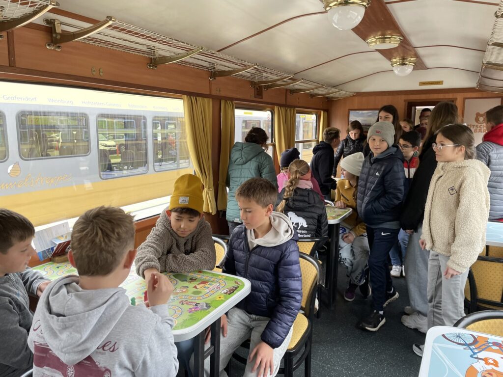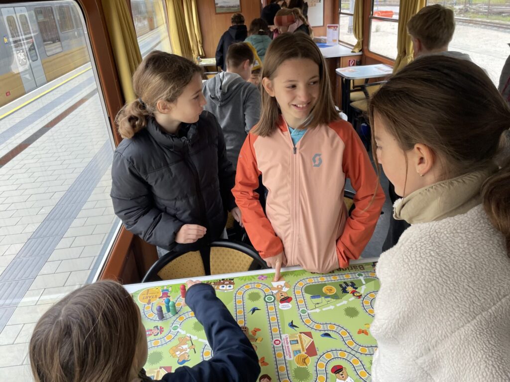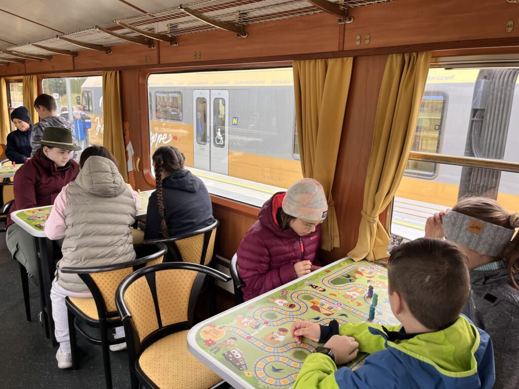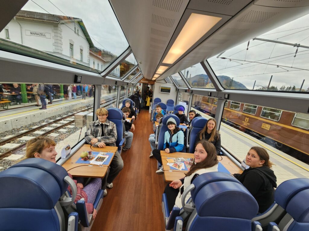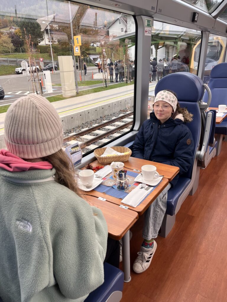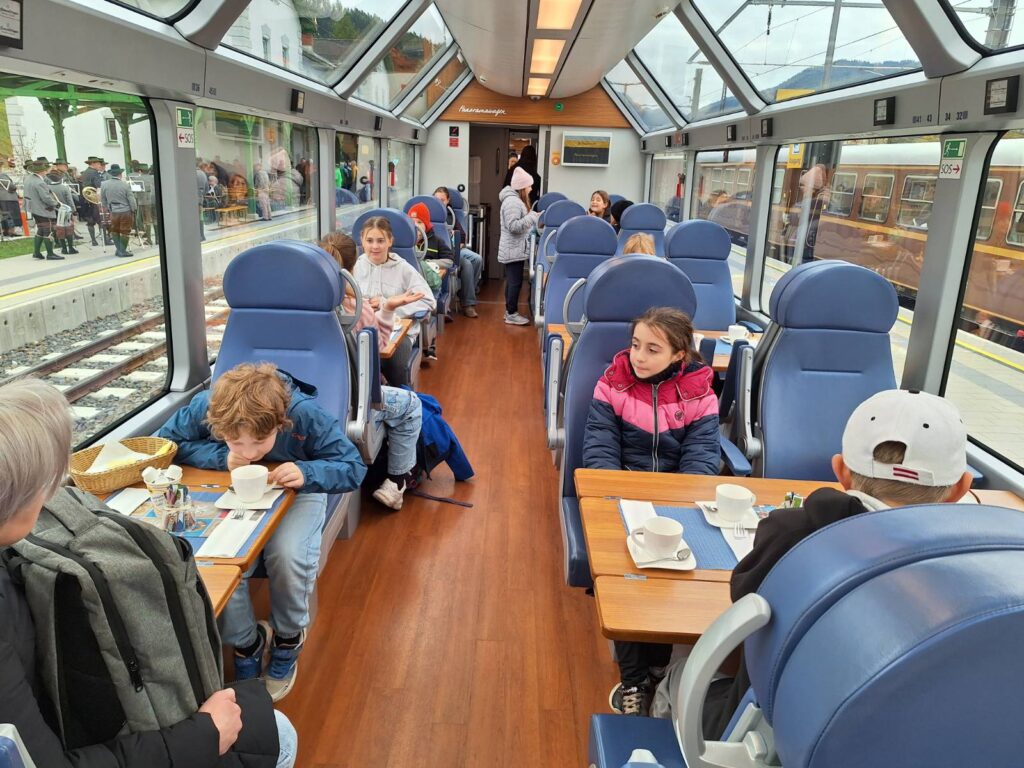 Die Panoramawagen 1. Klasse mit den großen Aussichtsfenstern und der edlen Ausstattung stellten für die Schüler*innen ein Highlight dar. Einige nutzten die Möglichkeit, dort gemütlich ein Getränk zu genießen und zu tratschen.