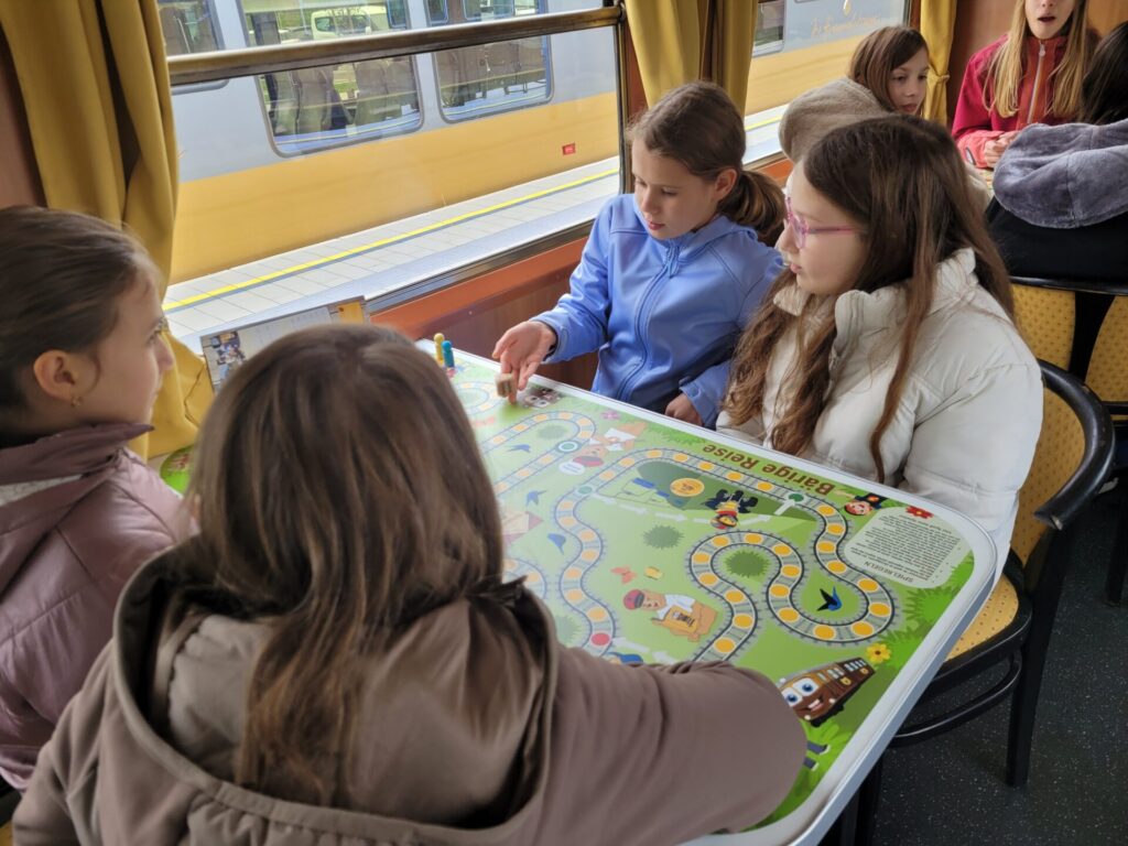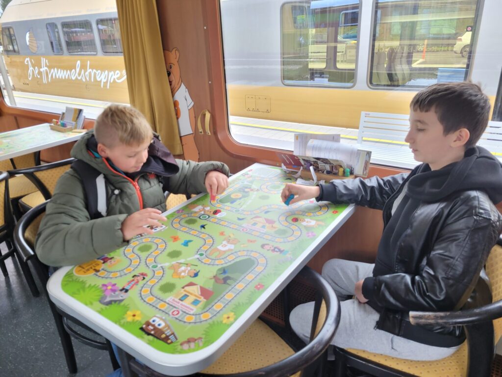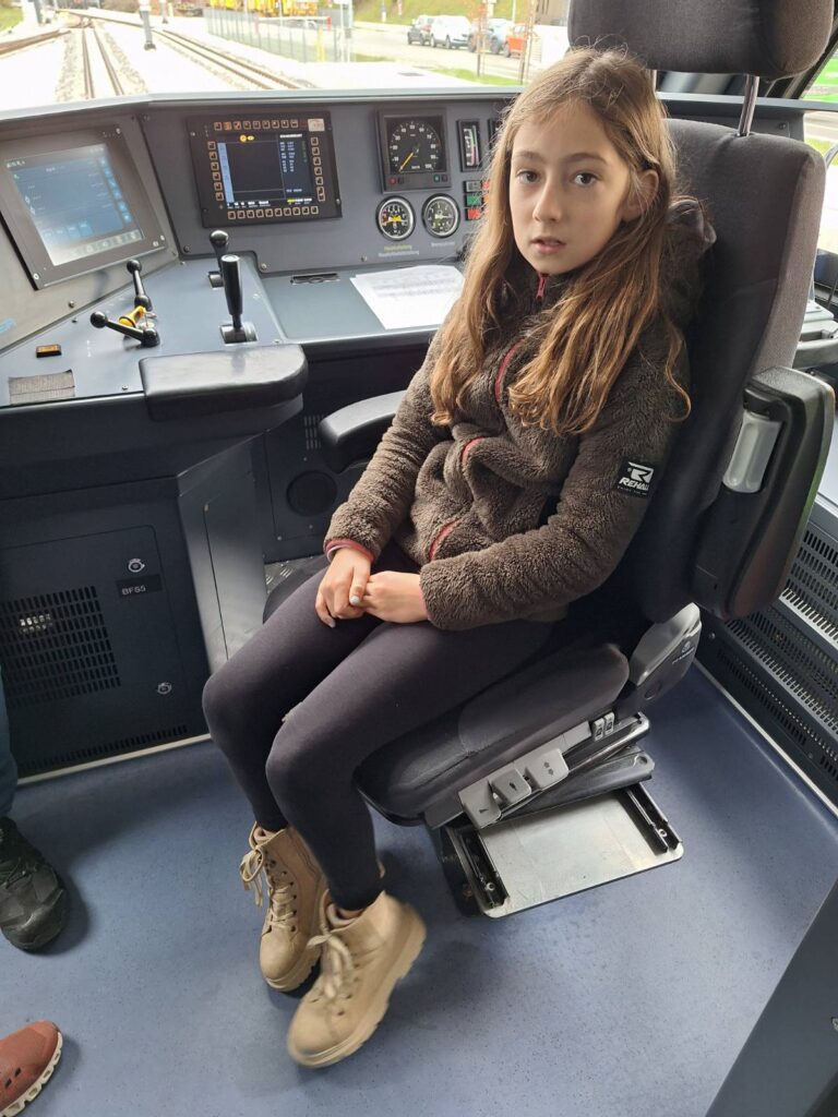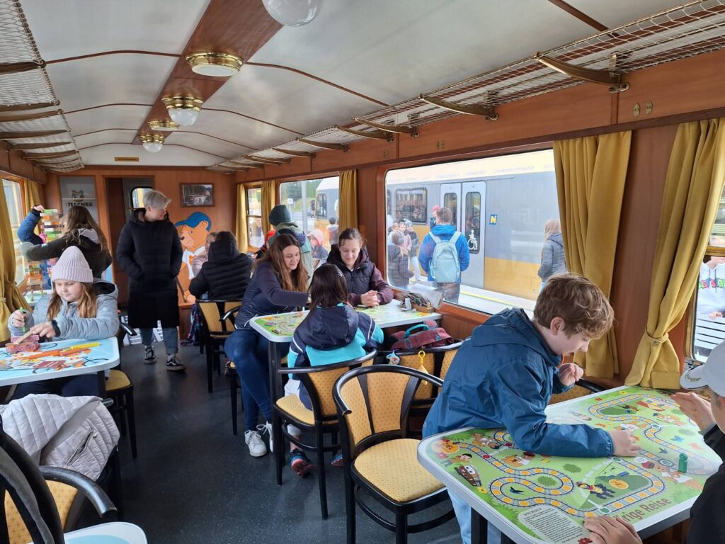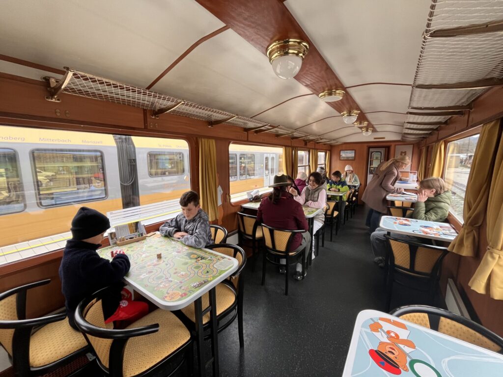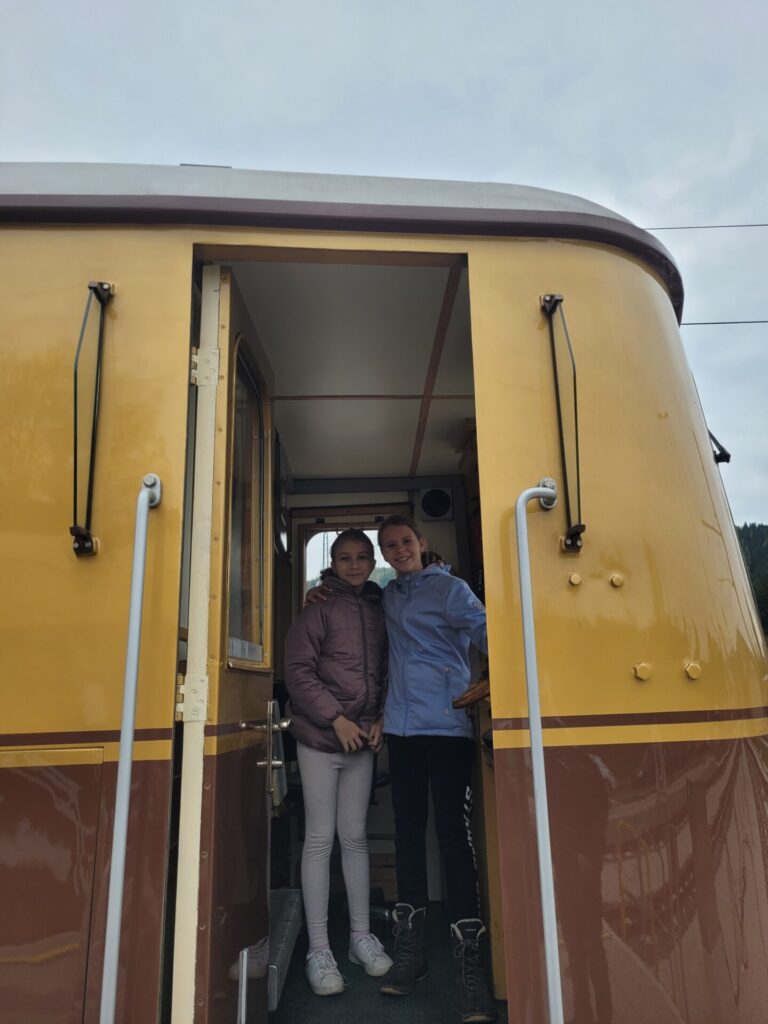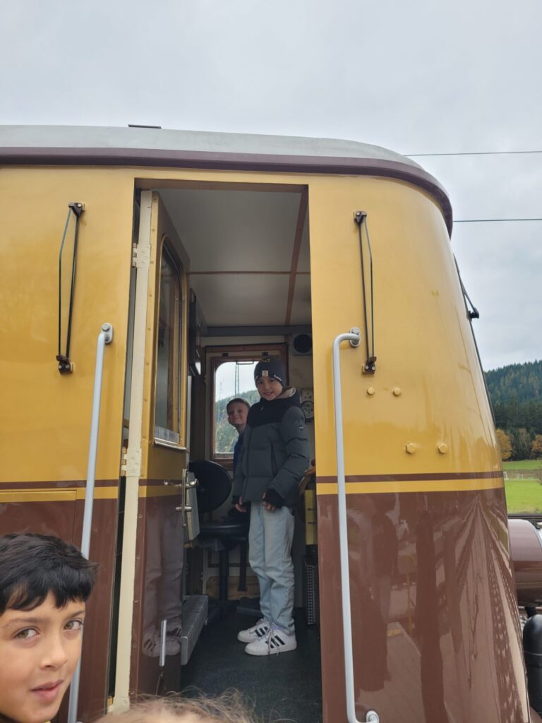 Auch die verschiedenen Fahrzeuge inspizierten wir ausführlich. Ein interessantes Zusammenspiel von Nostalgie und Moderne, denn zwischen den E-Loks des Ötscherbären und den Himmelstreppe-Triebwagen liegen mehr als 100 Jahre Eisenbahngeschichte. Wir durften in den Führerstand der Himmelstreppe, außerdem in die Waggons des Erlebniszugs Ötscherbär. Hier hatte es besonders der luftige Aussichtswagen vielen angetan, ebenso der Spielewagen.