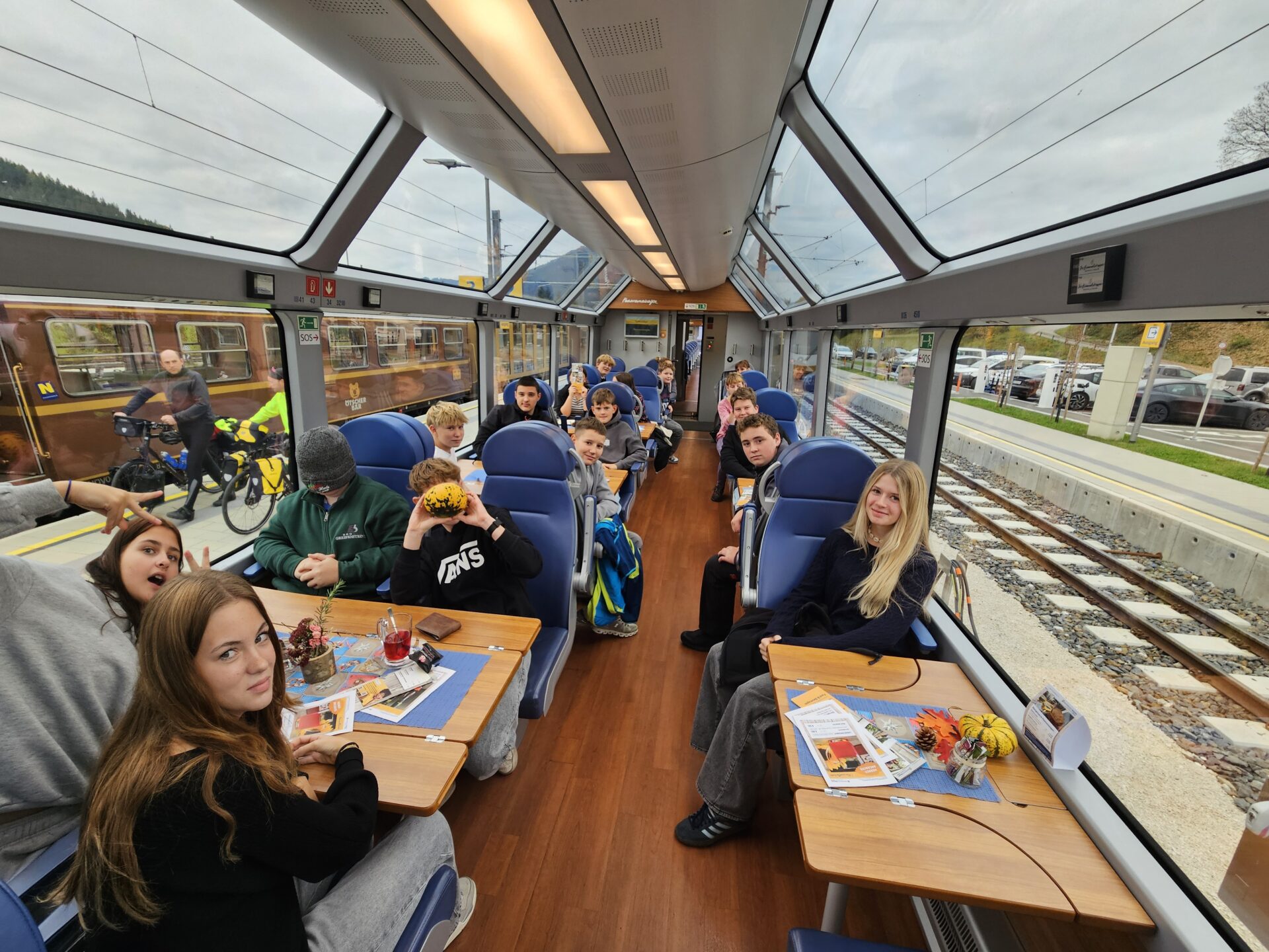 Die Panoramawagen 1. Klasse mit den großen Aussichtsfenstern und der edlen Ausstattung stellten für die Schüler*innen ein Highlight dar. Einige nutzten die Möglichkeit, dort gemütlich ein Getränk zu genießen und zu tratschen.