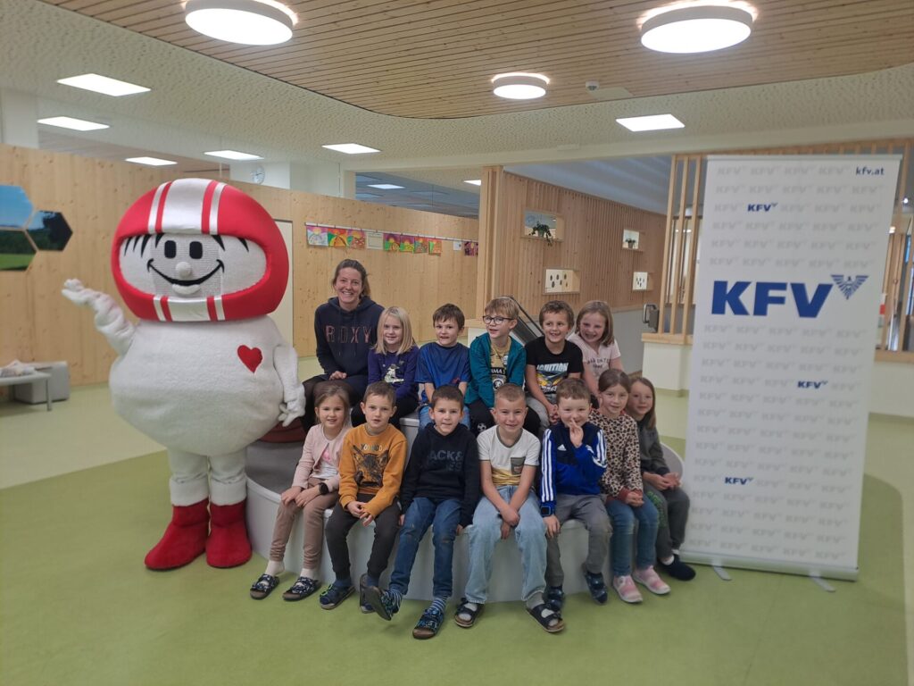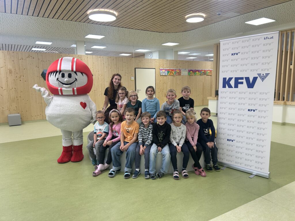 Heute bekamen wir besonderen Besuch: Zwei Damen vom KFV (Kuratorium für Verkehrssicherheit) kamen gemeinsam mit Helmi und seinem treuen Hund zu uns in die Schule.
