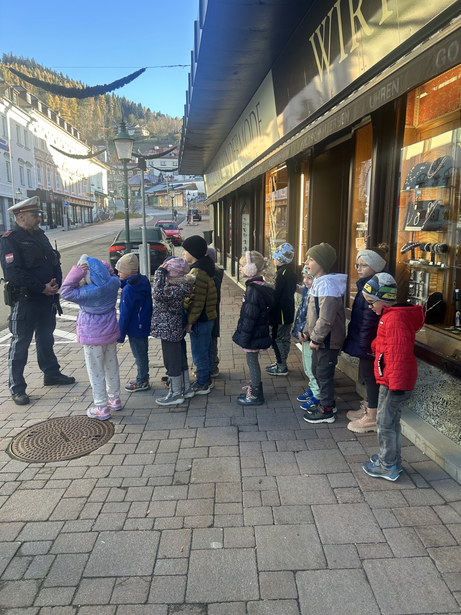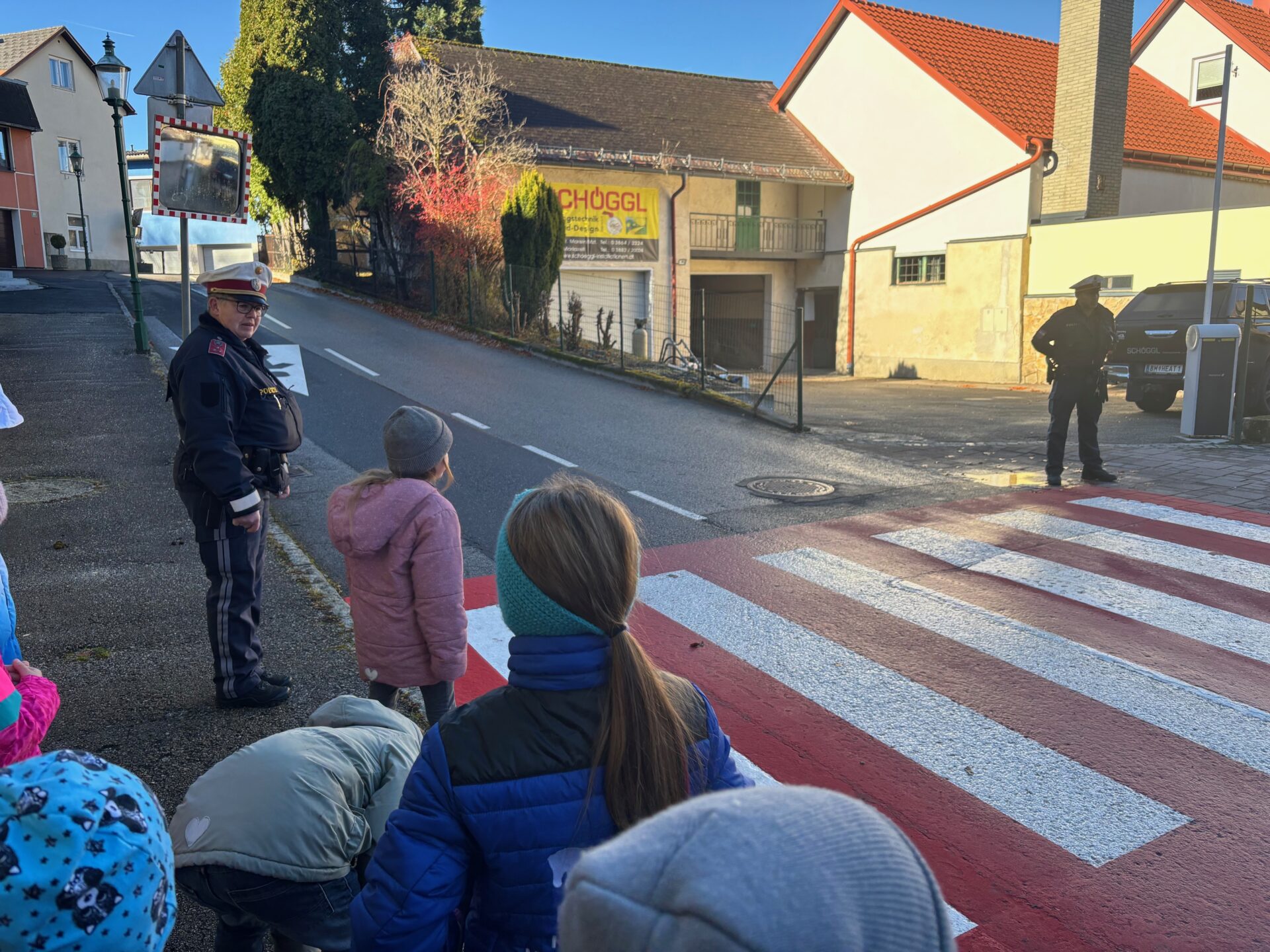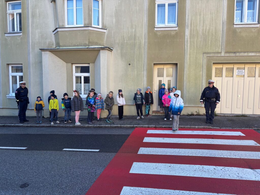 Gemeinsam mit drei Polizisten*innen übten unsere Schülerinnen und Schüler das richtige Verhalten im Straßenverkehr. Dabei lernten sie, wie man den Schulweg sicher bewältigt, Zebrastreifen richtig überquert und verkehrssichere Übergänge erkennt.