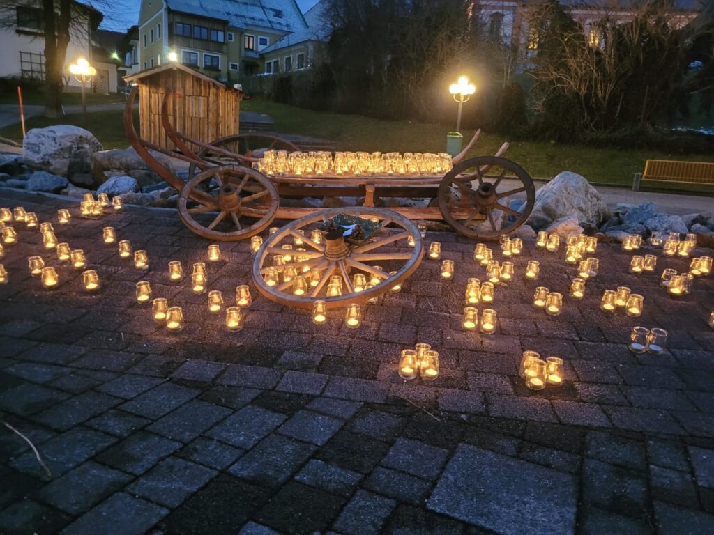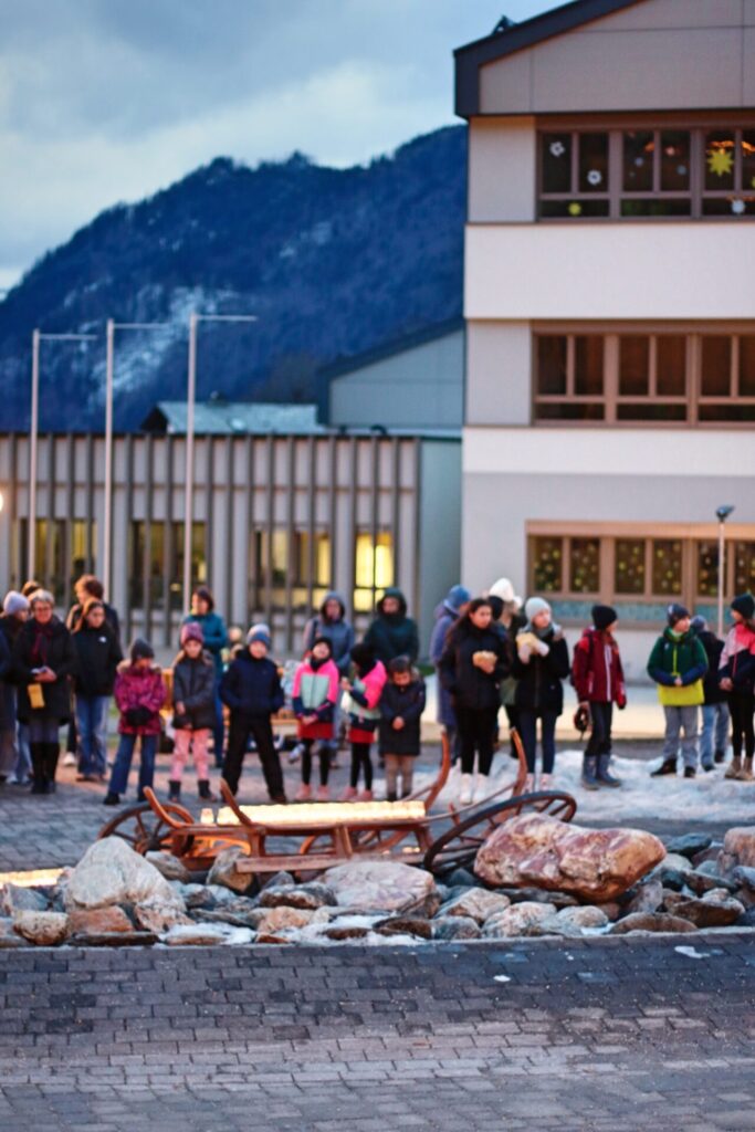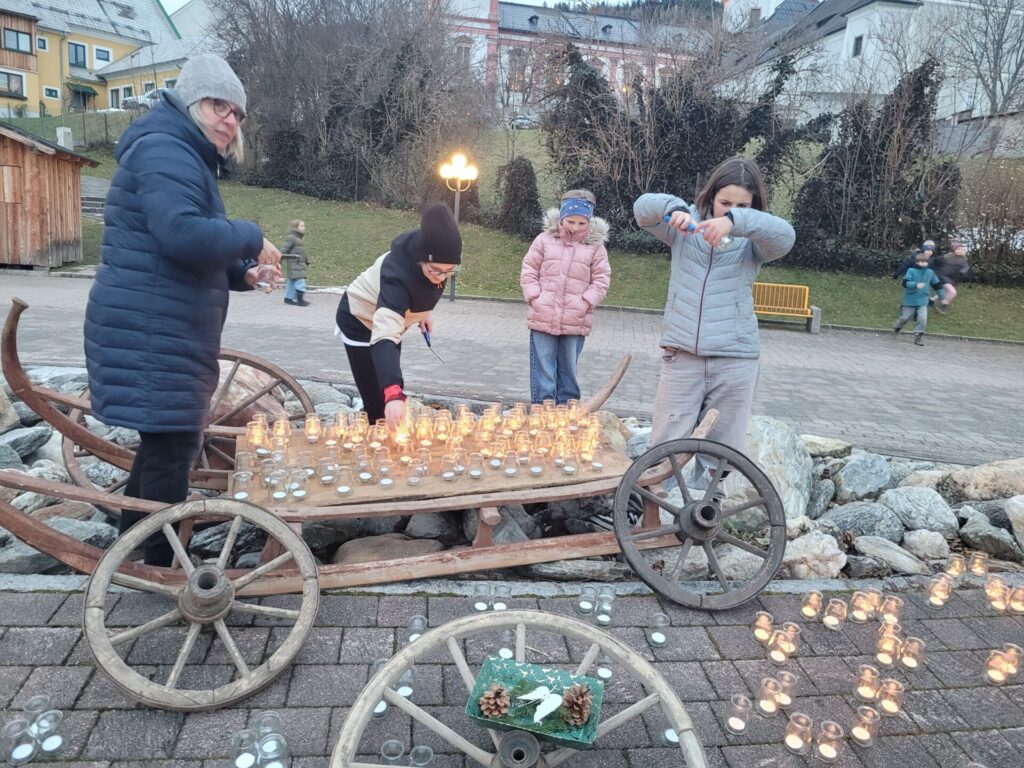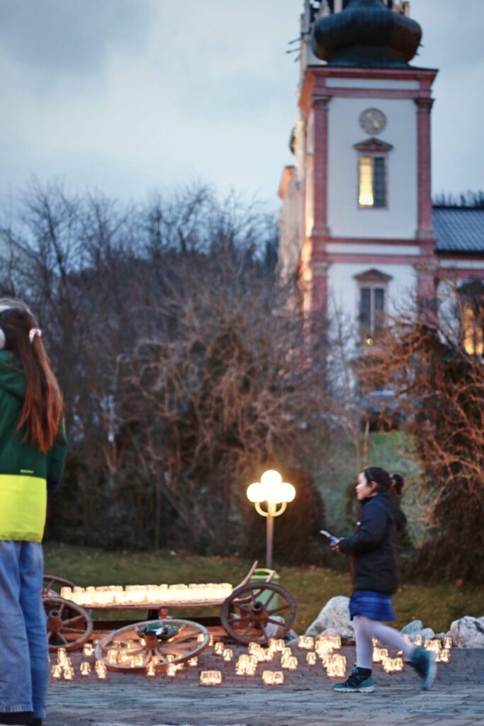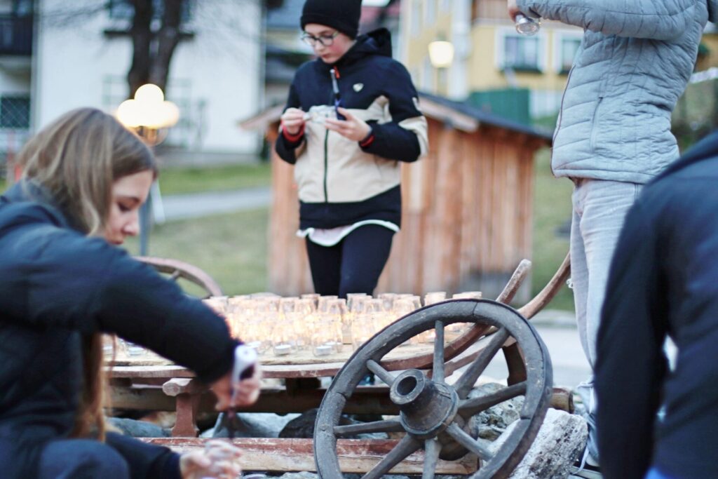 Das Highlight der Veranstaltung war unser Lichtermeer. Während des Adventmarktes konnte man an der Lichterstation Kerzen kaufen, diese wurden alle um 16:30 Uhr beim Brunnen vor dem Schulgebäude angezündet. Für noch festlichere Stimmung sorgte dabei das Lied „Advent is a Leuchtn“.
