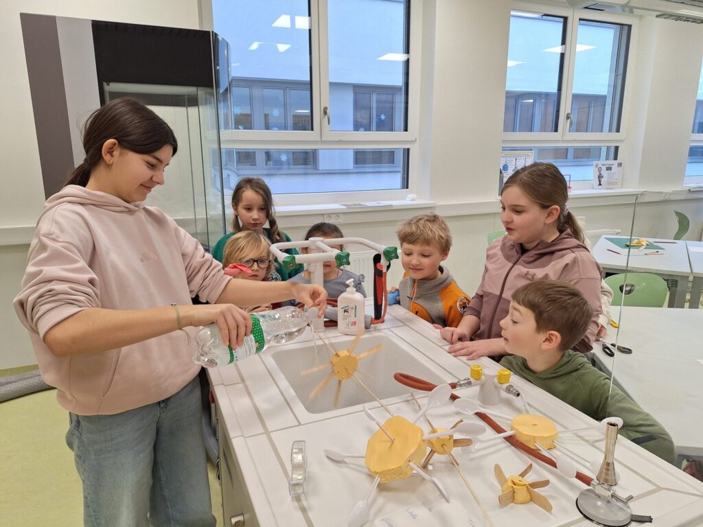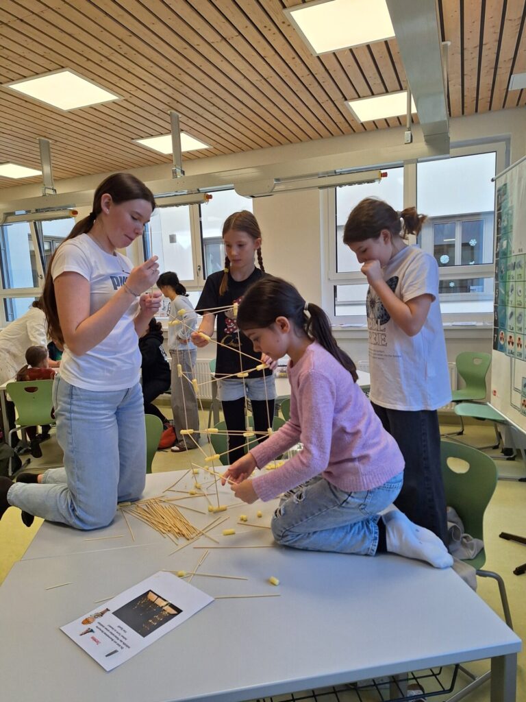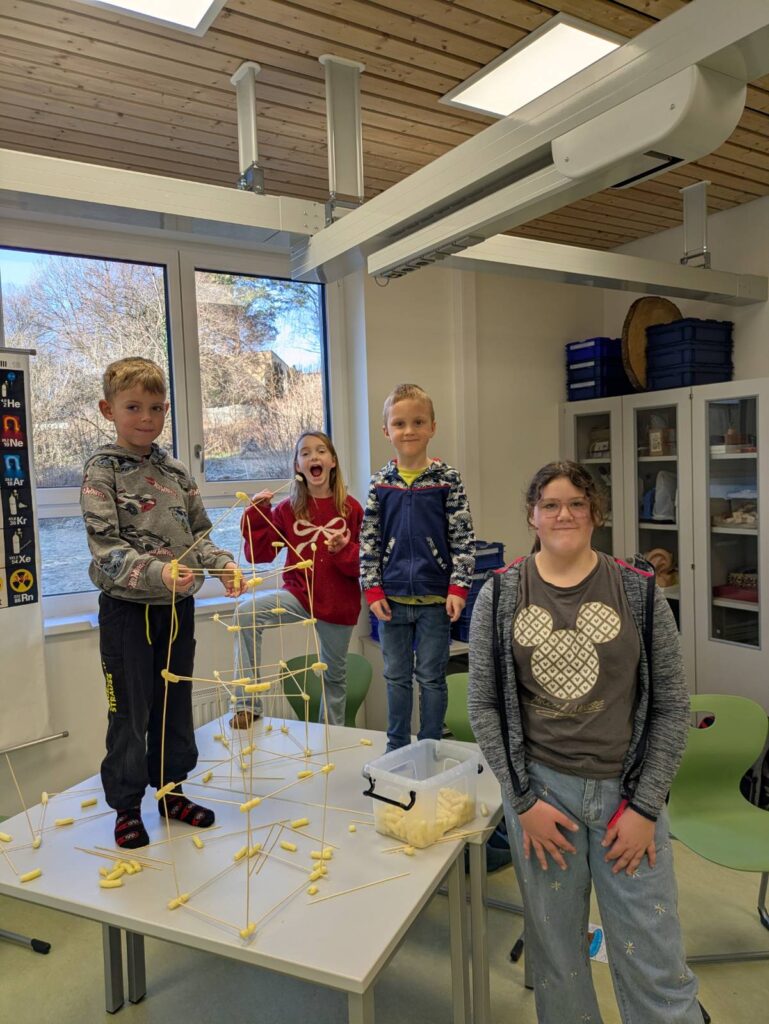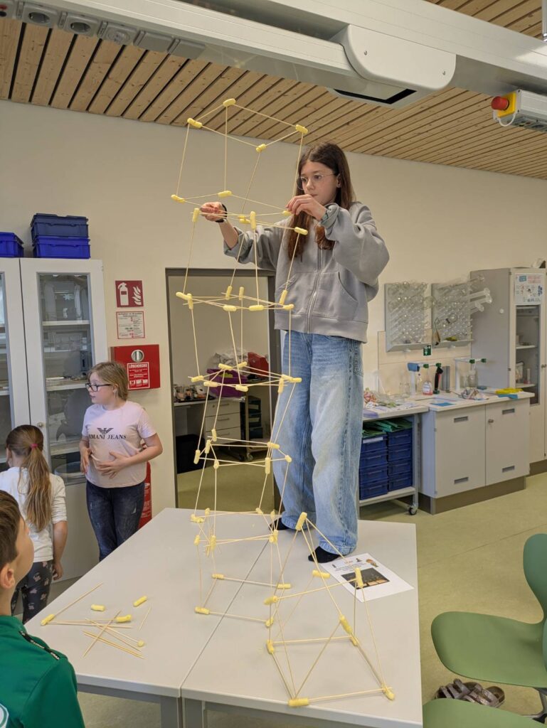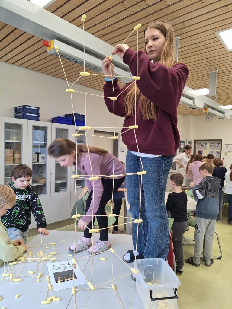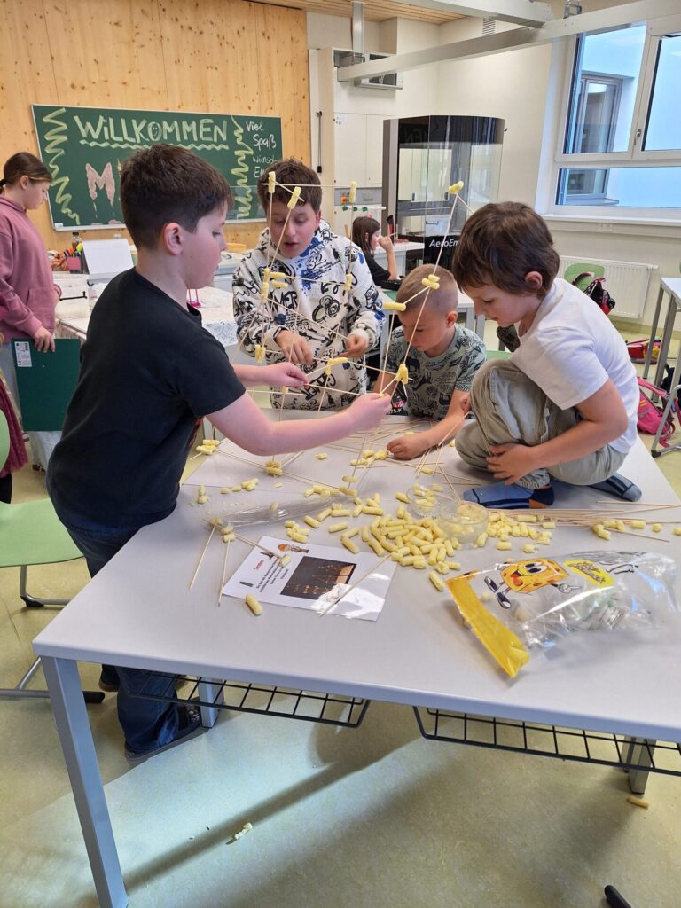 Selbst Forschen und Entdecken war im MINT-Raum angesagt. So bastelten und betrieben die Kinder ihre eigene Kaplan-Turbine, sie wurden handwerklich aktiv und konnten mit ihren beeindruckend hohen Türmen aus Spaghettinudeln und Marshmallows hautnah die Prinzipien der Gravitation und Statik erleben. Viel Begeisterung rief auch das Hantieren mit der nicht-newtonschen Flüssigkeit hervor, welche sich anders als gewöhnliche Flüssigkeiten verhält. Ihre Zähigkeit ist abhängig von der einwirkenden Kraft.