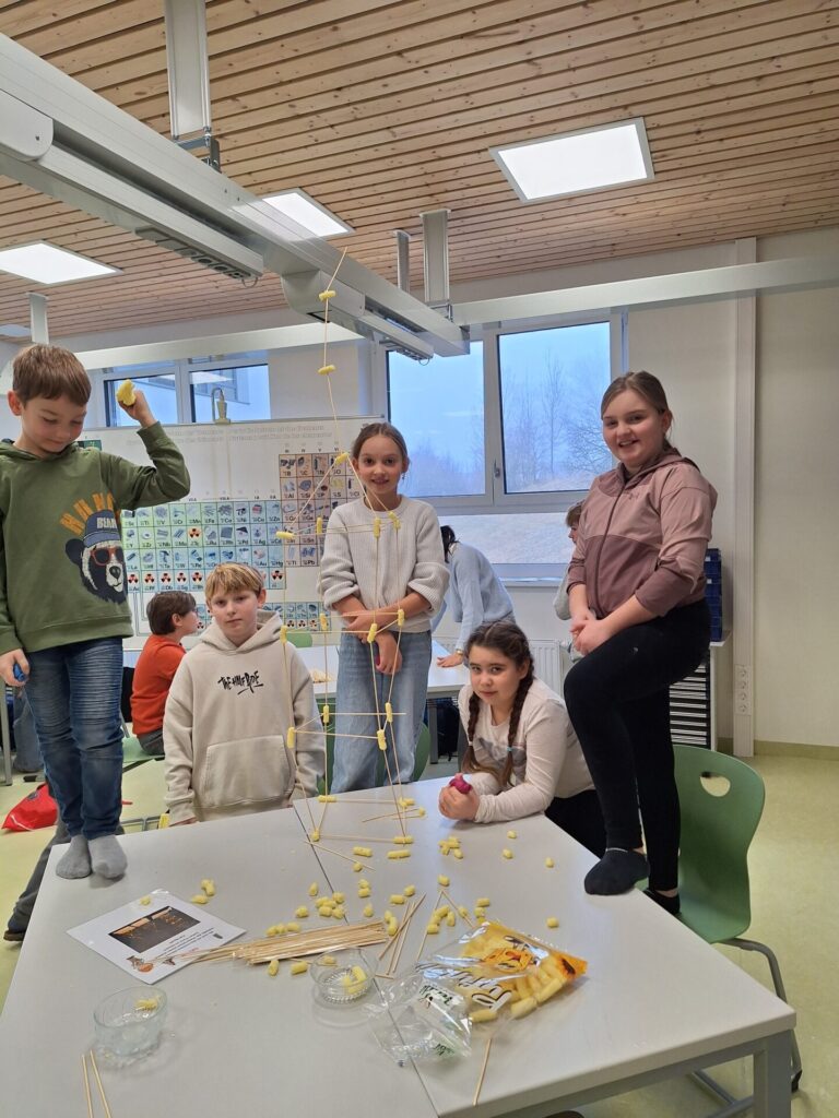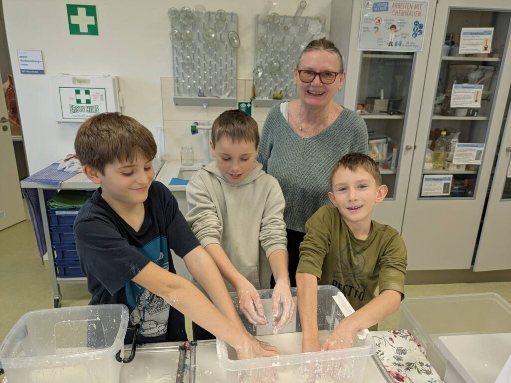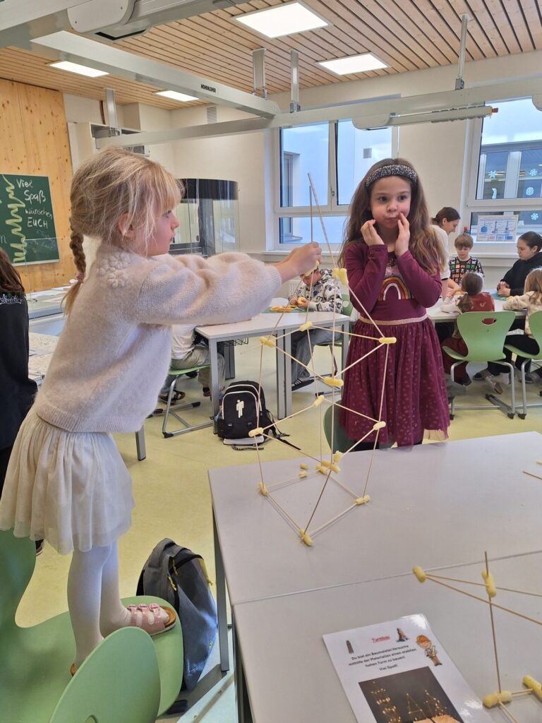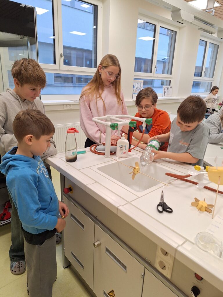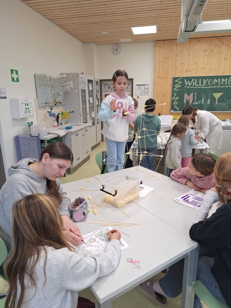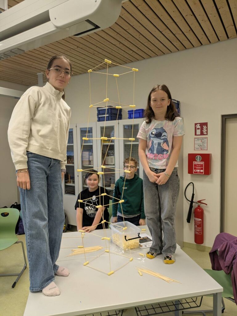 Selbst Forschen und Entdecken war im MINT-Raum angesagt. So bastelten und betrieben die Kinder ihre eigene Kaplan-Turbine, sie wurden handwerklich aktiv und konnten mit ihren beeindruckend hohen Türmen aus Spaghettinudeln und Marshmallows hautnah die Prinzipien der Gravitation und Statik erleben. Viel Begeisterung rief auch das Hantieren mit der nicht-newtonschen Flüssigkeit hervor, welche sich anders als gewöhnliche Flüssigkeiten verhält. Ihre Zähigkeit ist abhängig von der einwirkenden Kraft.
