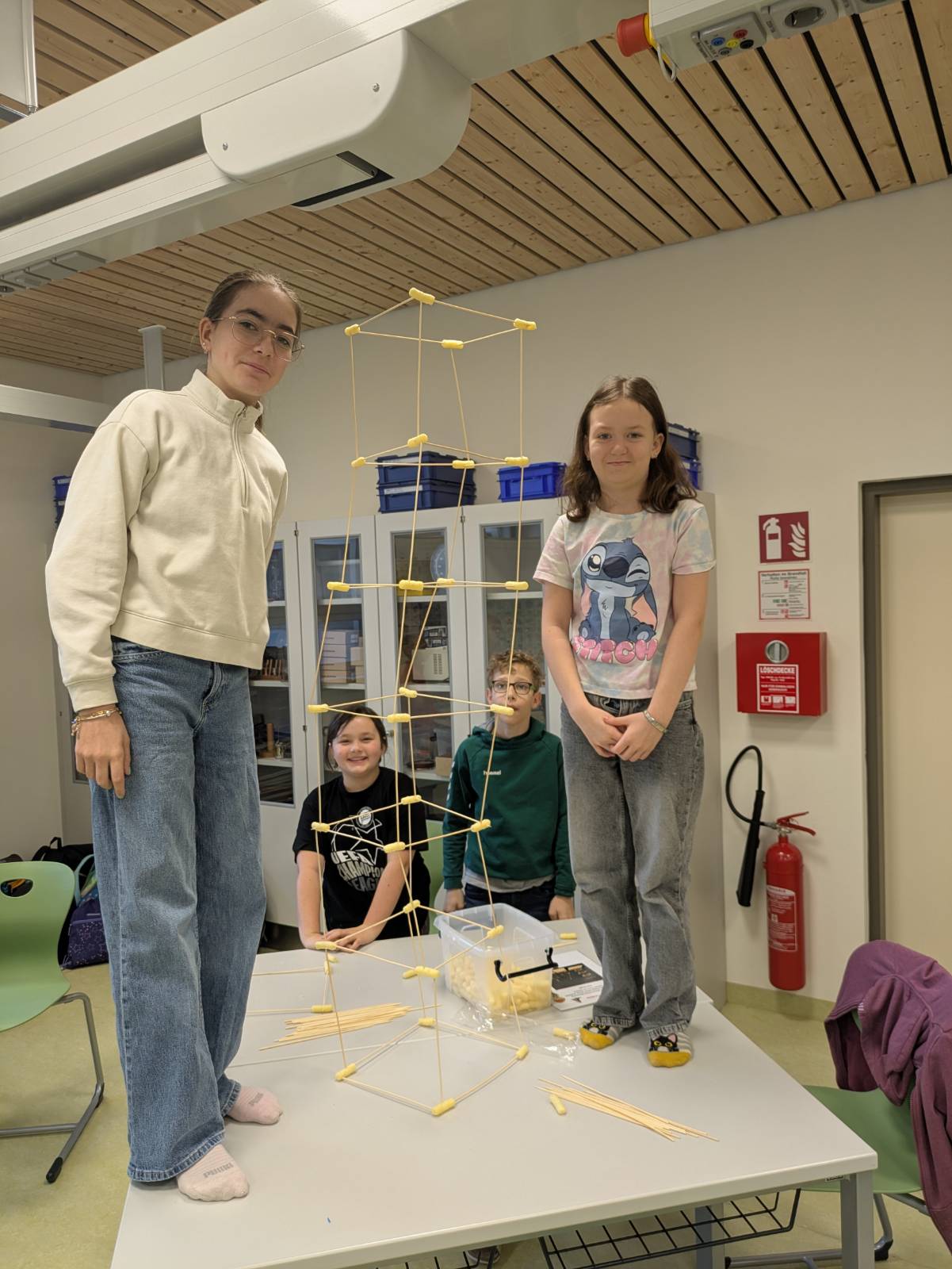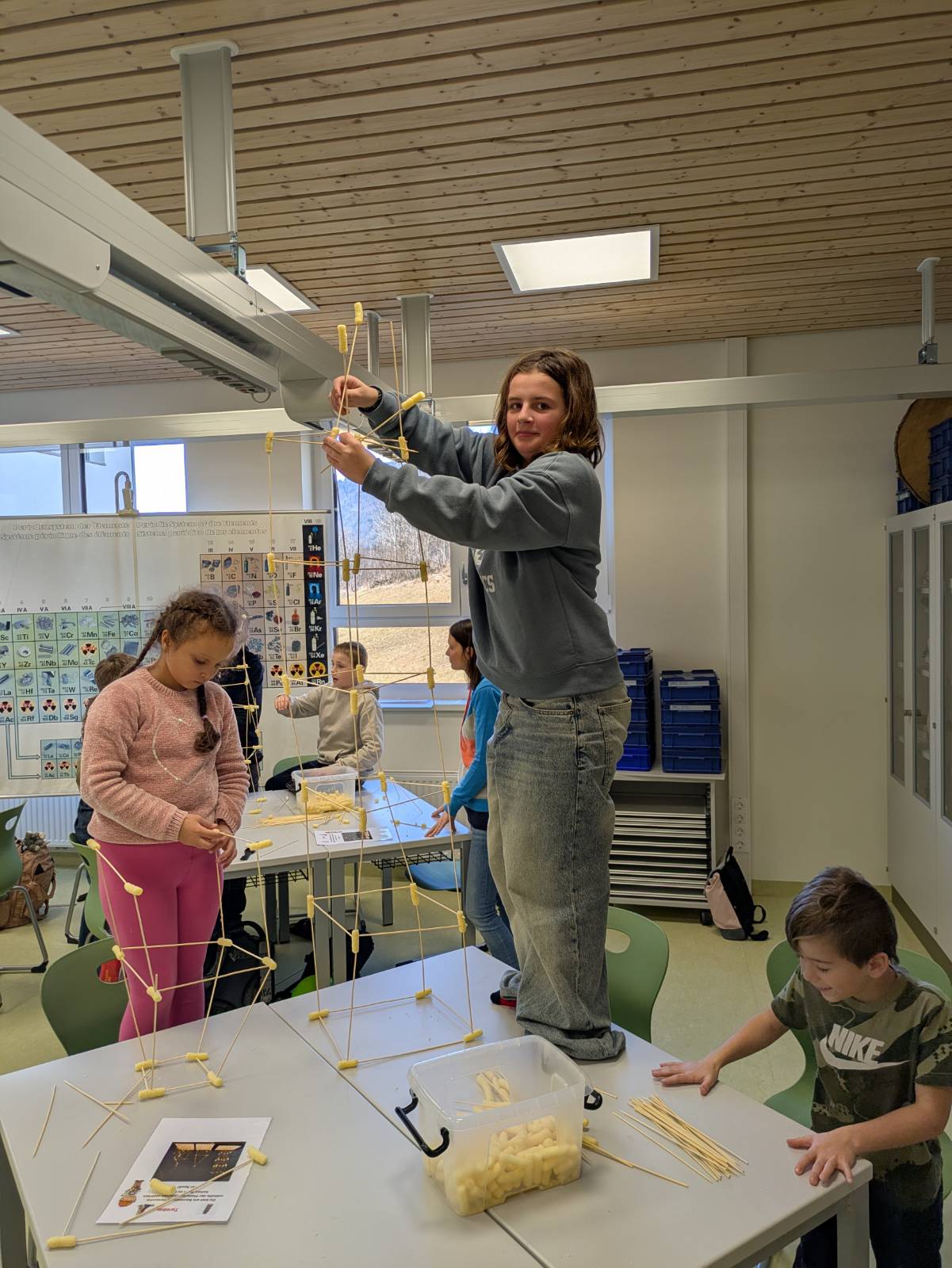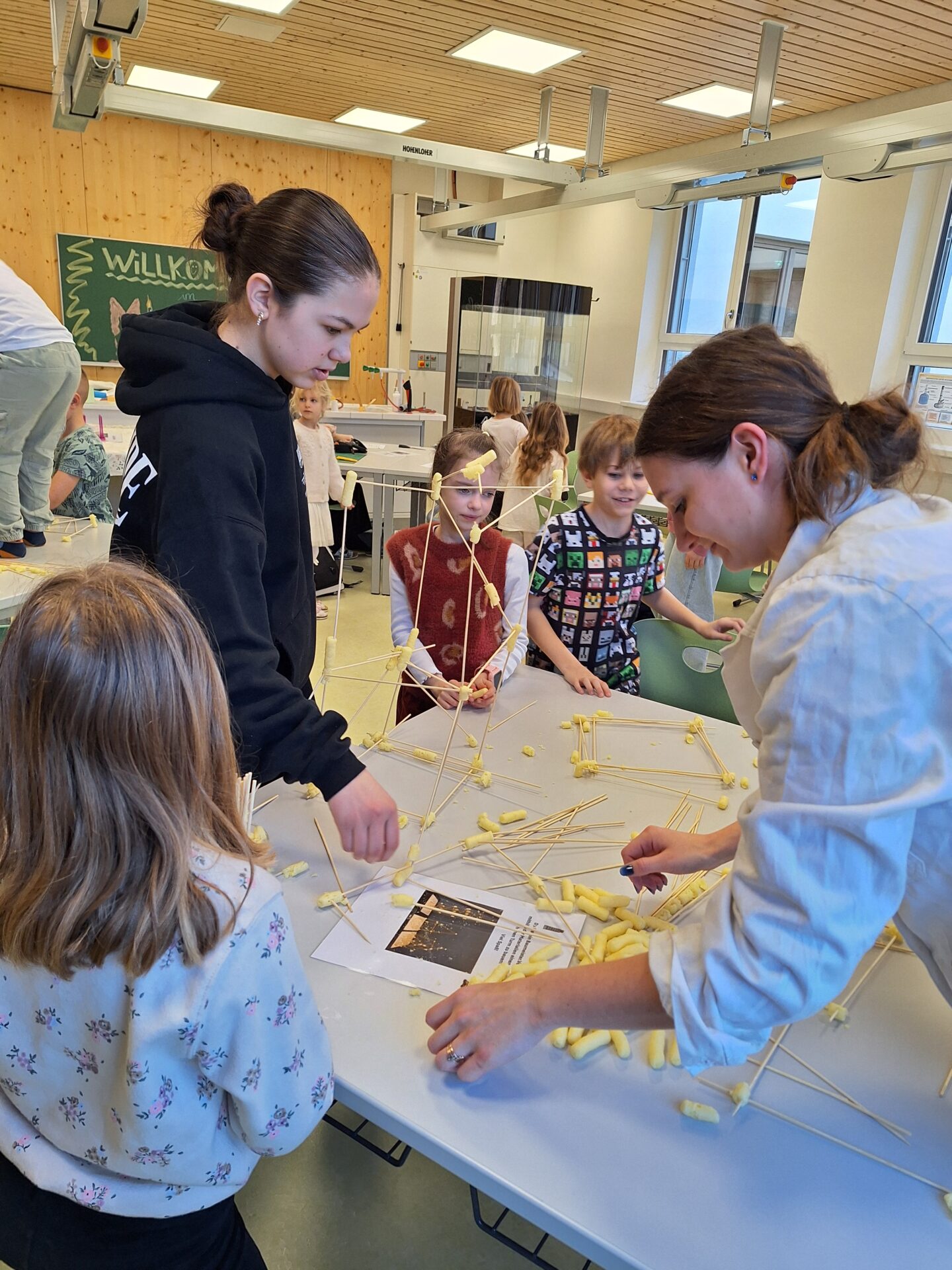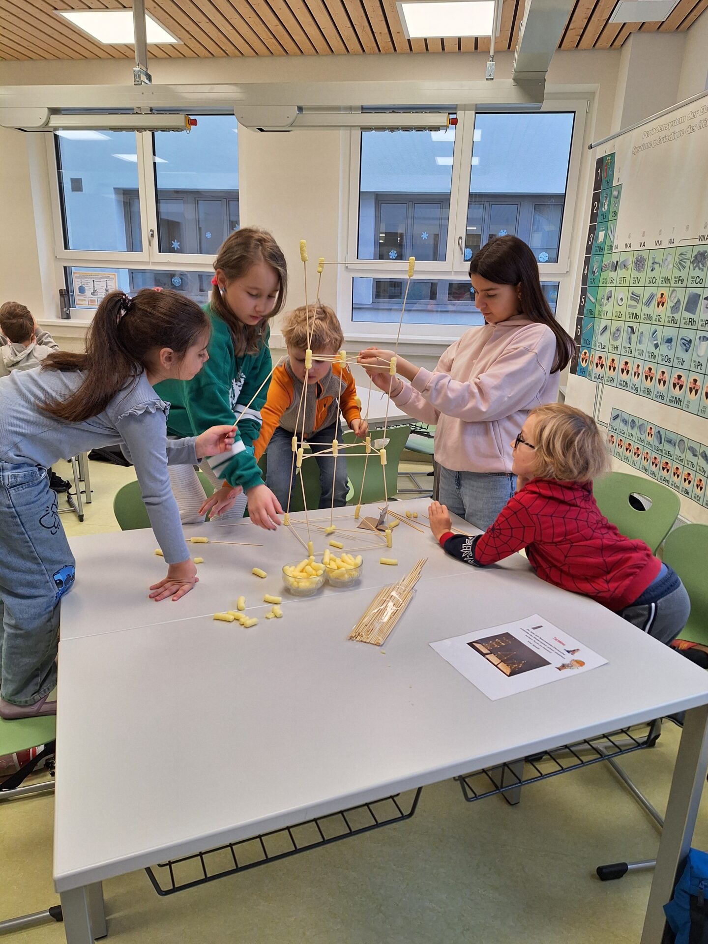 Selbst Forschen und Entdecken war im MINT-Raum angesagt. So bastelten und betrieben die Kinder ihre eigene Kaplan-Turbine, sie wurden handwerklich aktiv und konnten mit ihren beeindruckend hohen Türmen aus Spaghettinudeln und Marshmallows hautnah die Prinzipien der Gravitation und Statik erleben. Viel Begeisterung rief auch das Hantieren mit der nicht-newtonschen Flüssigkeit hervor, welche sich anders als gewöhnliche Flüssigkeiten verhält. Ihre Zähigkeit ist abhängig von der einwirkenden Kraft.