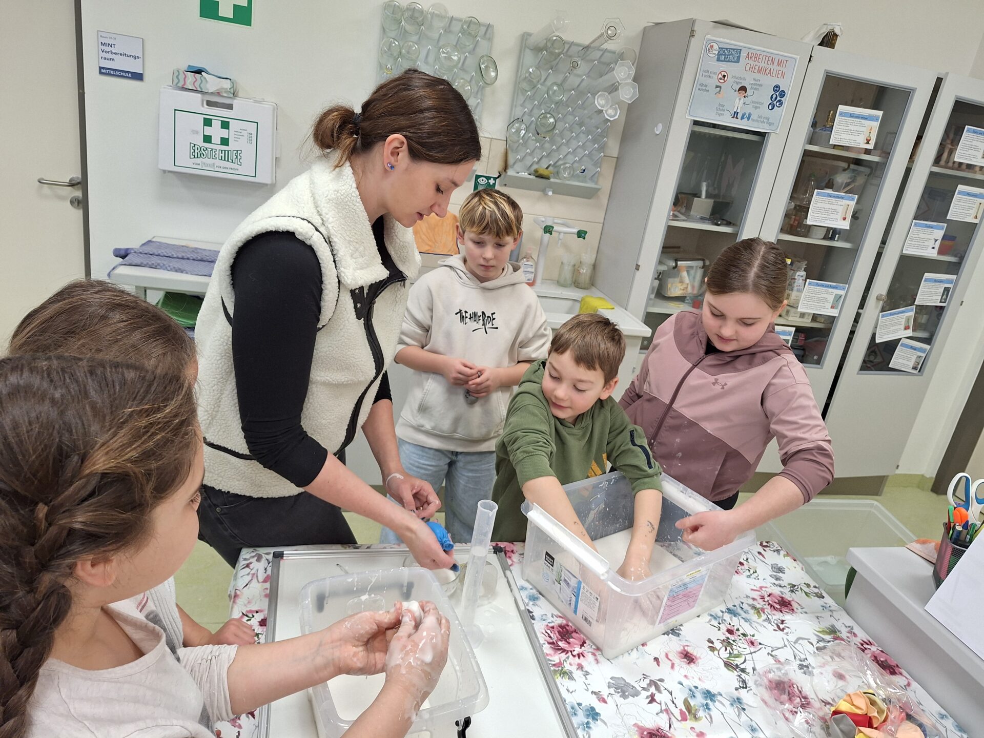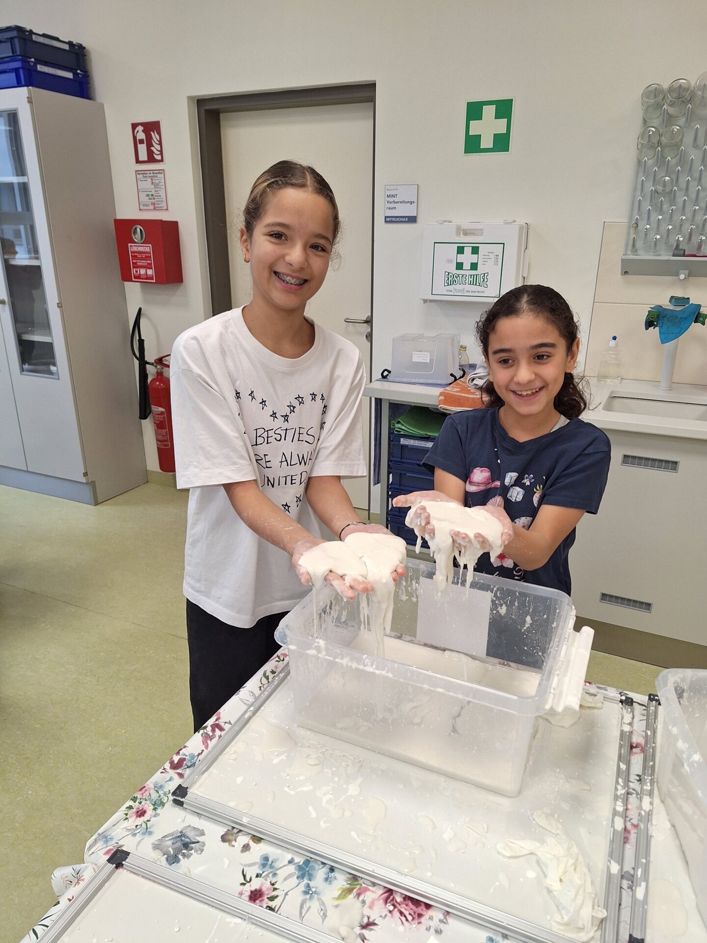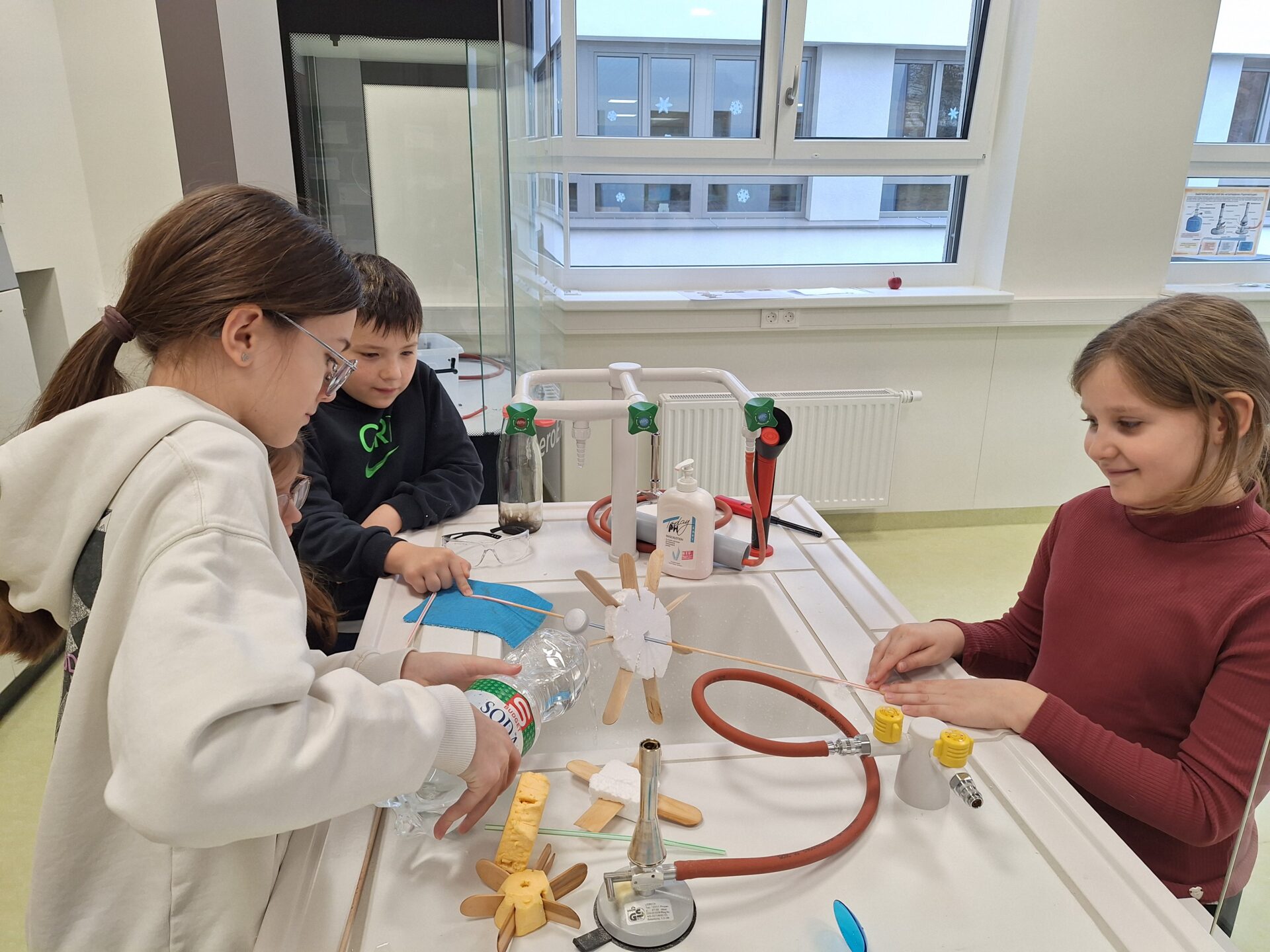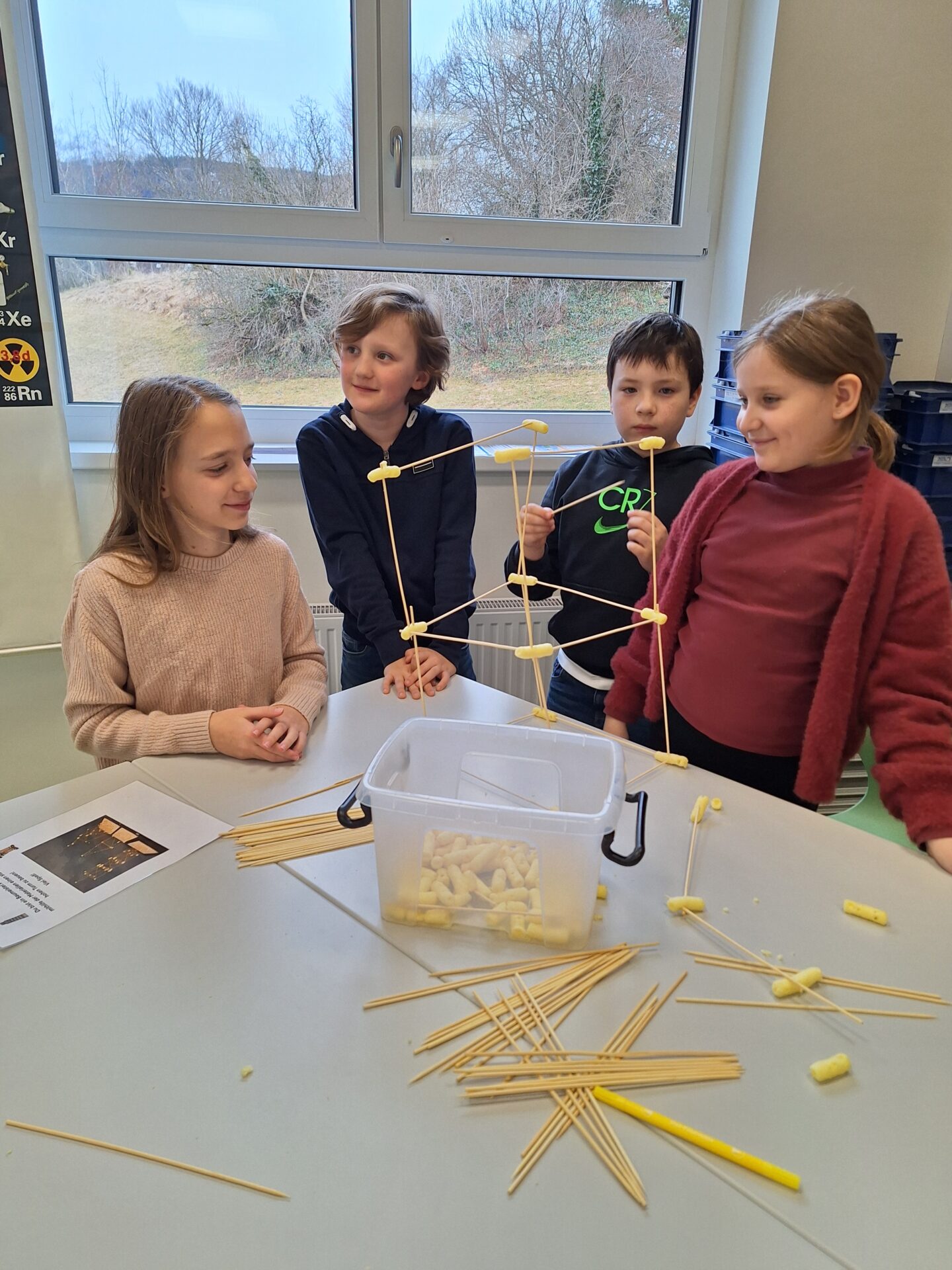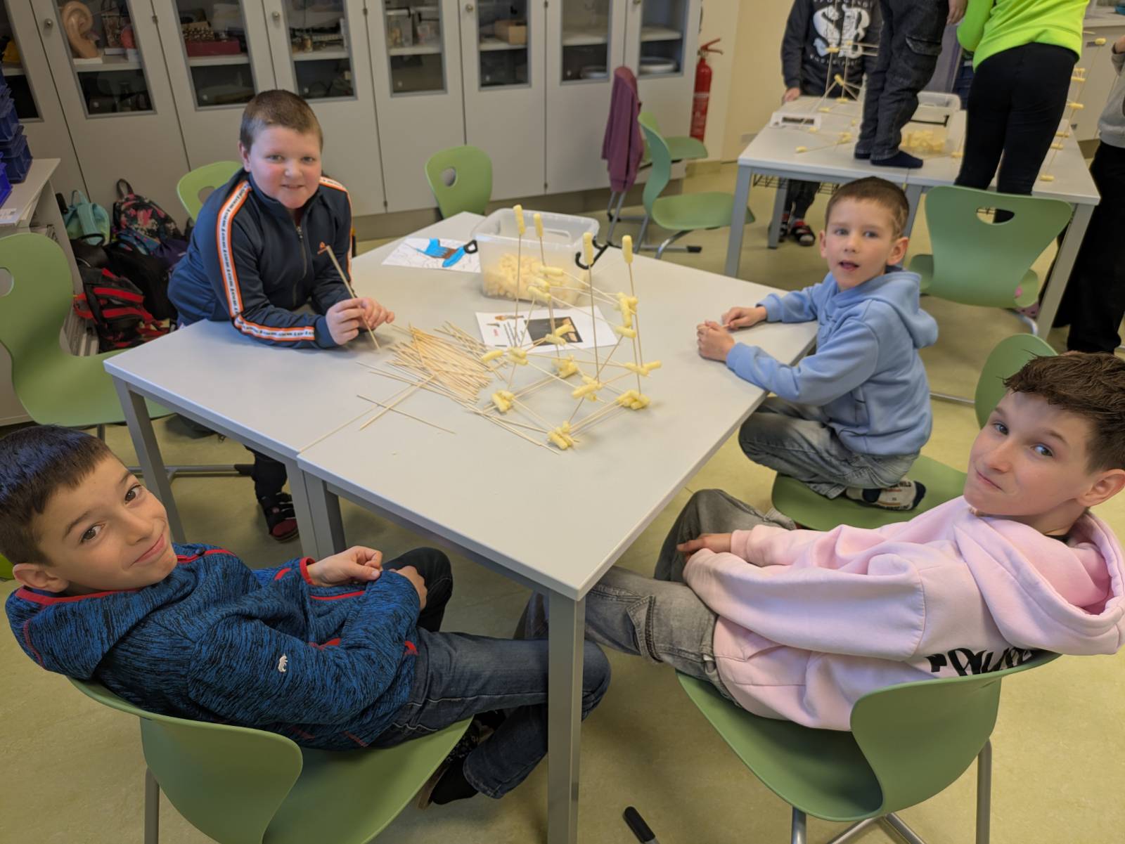 Selbst Forschen und Entdecken war im MINT-Raum angesagt. So bastelten und betrieben die Kinder ihre eigene Kaplan-Turbine, sie wurden handwerklich aktiv und konnten mit ihren beeindruckend hohen Türmen aus Spaghettinudeln und Marshmallows hautnah die Prinzipien der Gravitation und Statik erleben. Viel Begeisterung rief auch das Hantieren mit der nicht-newtonschen Flüssigkeit hervor, welche sich anders als gewöhnliche Flüssigkeiten verhält. Ihre Zähigkeit ist abhängig von der einwirkenden Kraft.