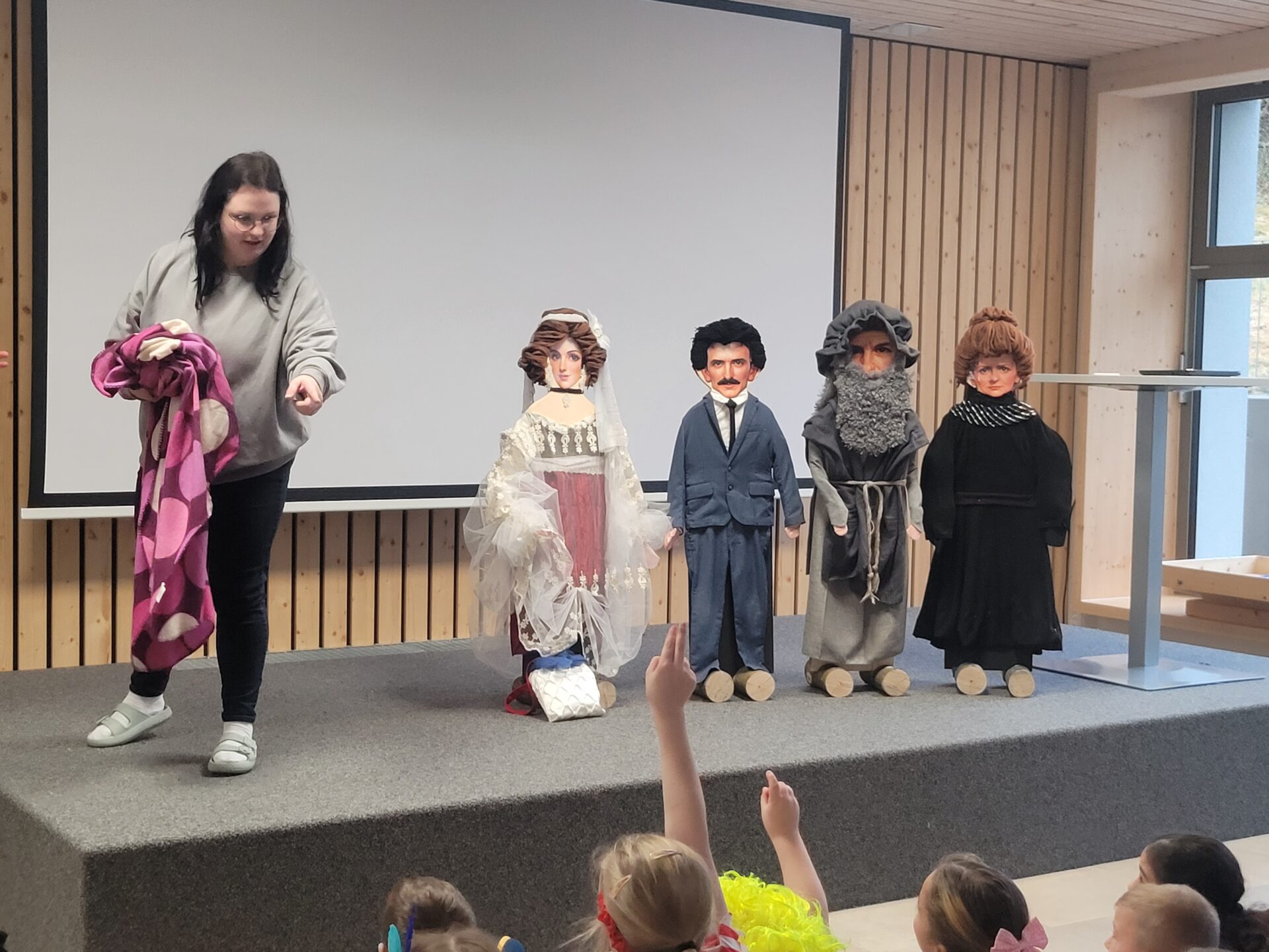 Im Werkraum durften sich die Schülerinnen und Schüler kreativ austoben und gestalteten Holzfiguren zu den berühmten Personen, die wir in dieser Woche kennengelernt haben. Viel Augenmerk wurde auf die authentische Kleidung, Kopfbedeckung und Frisur der Figuren gelegt, um ihnen Leben einzuhauchen.