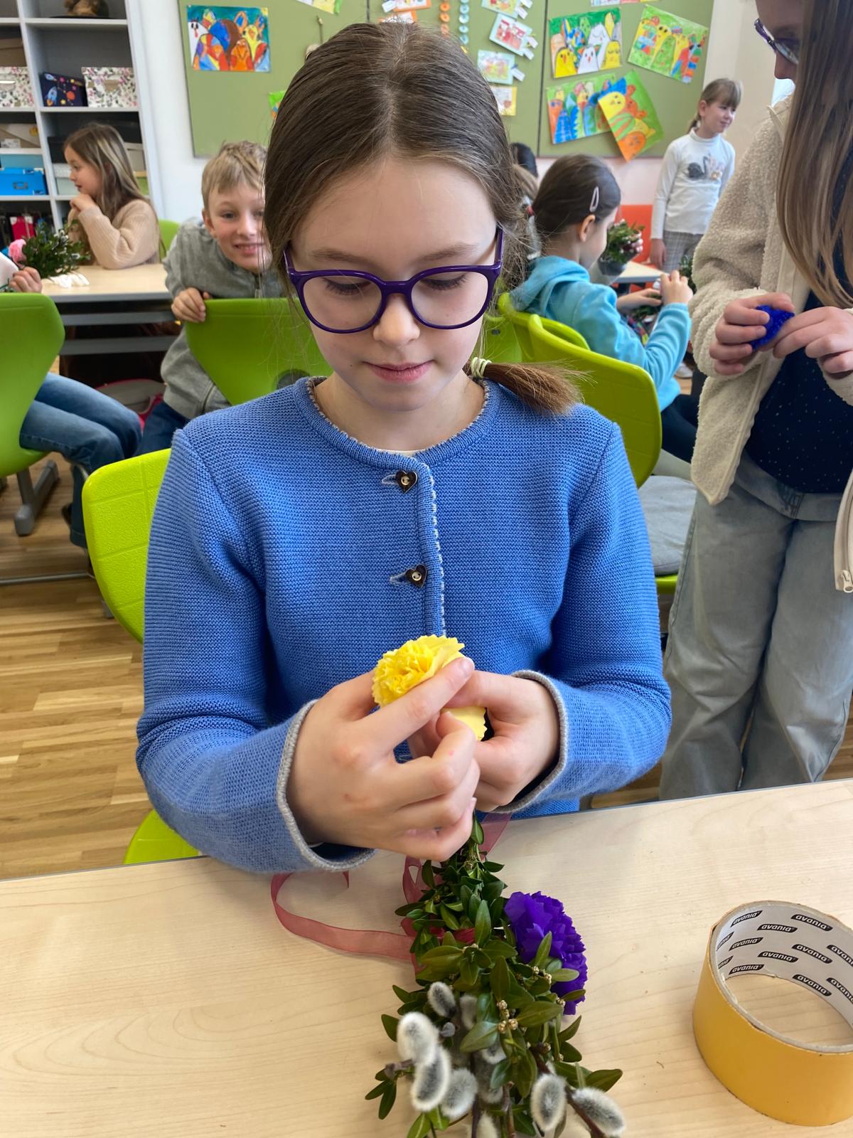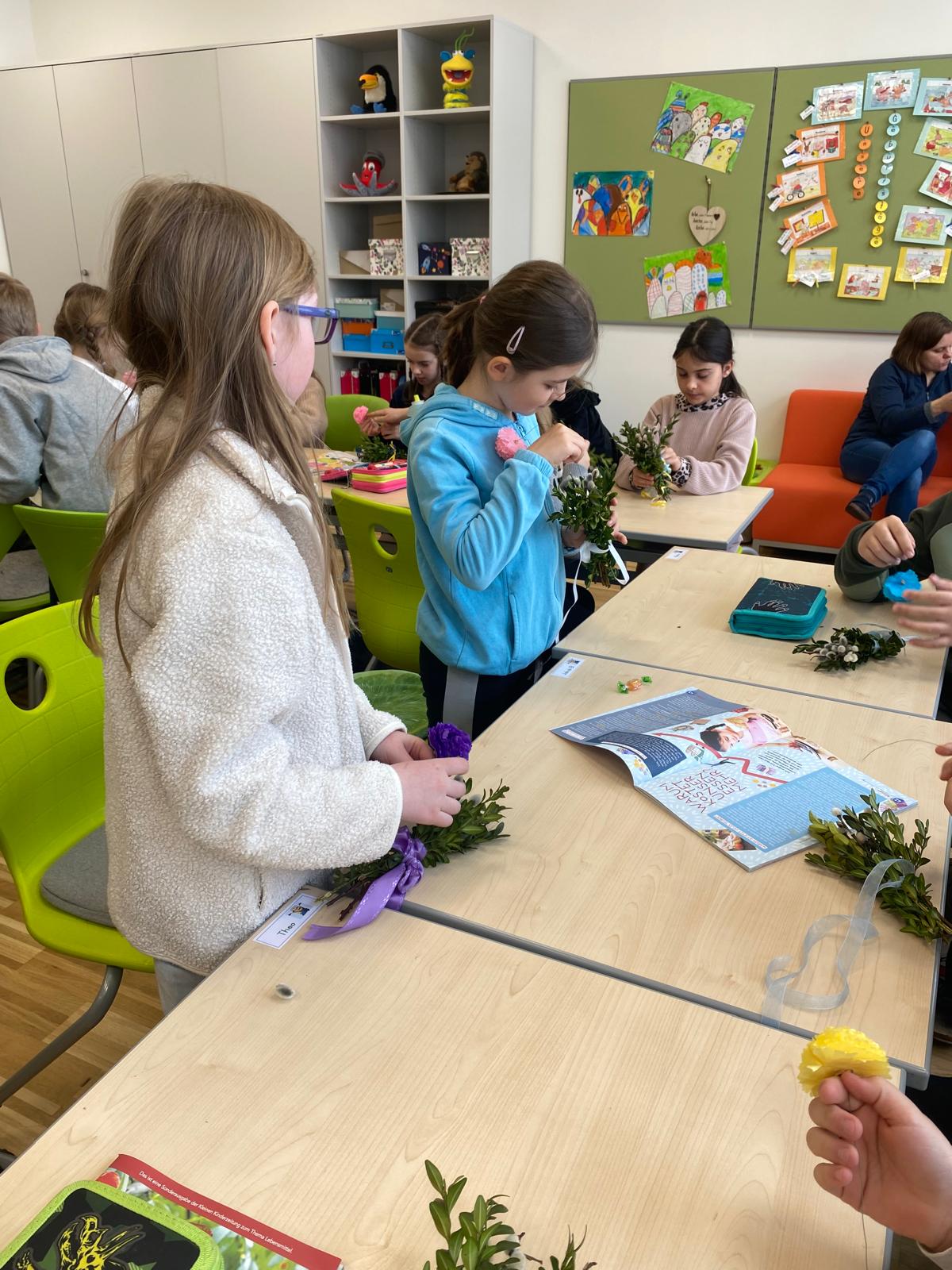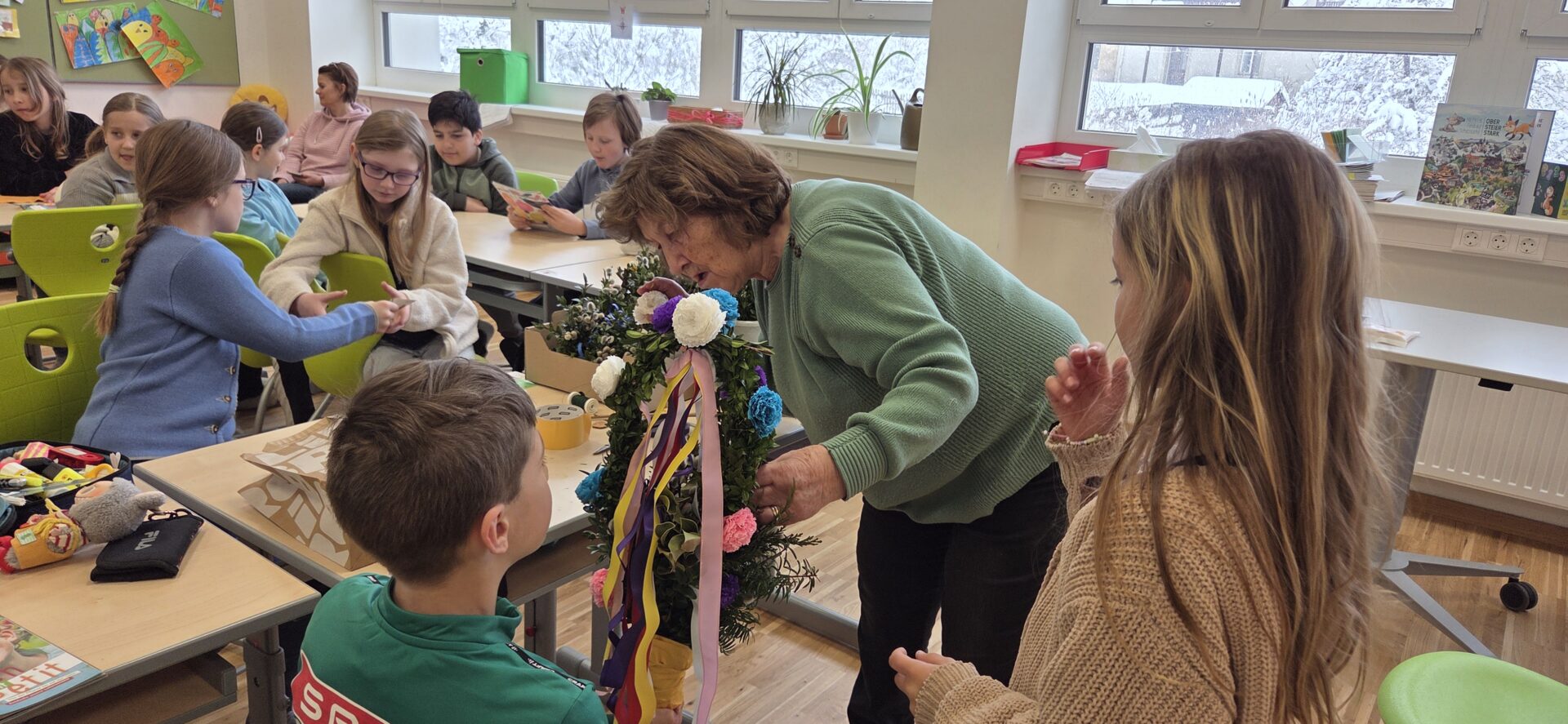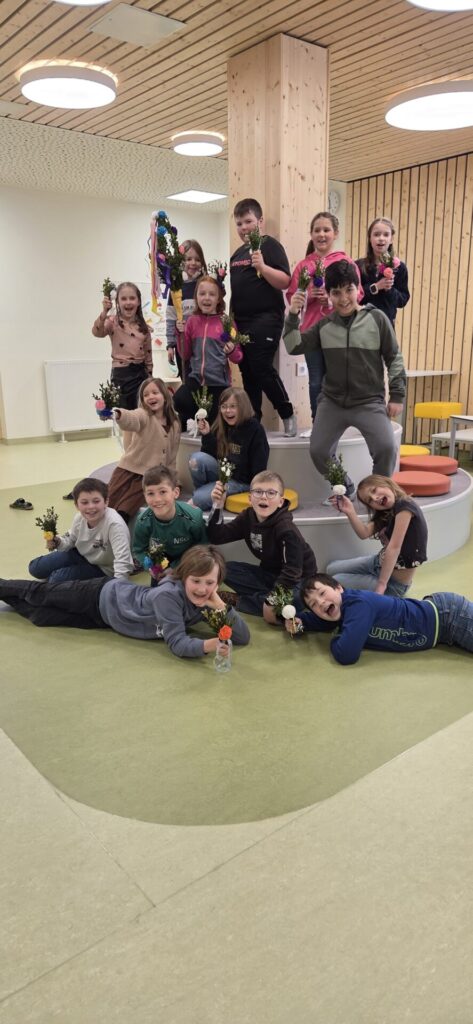 Frau Leodolter besuchte die 3. Volksschulklassen und zeigte den Kindern, wie man Palmbuschen bindet. Mit großer Begeisterung und Freude waren alle bei der Sache und gestalteten ihre eigenen kleinen Palmbuschen. Ein schöner und lehrreicher Vormittag für die Kinder!