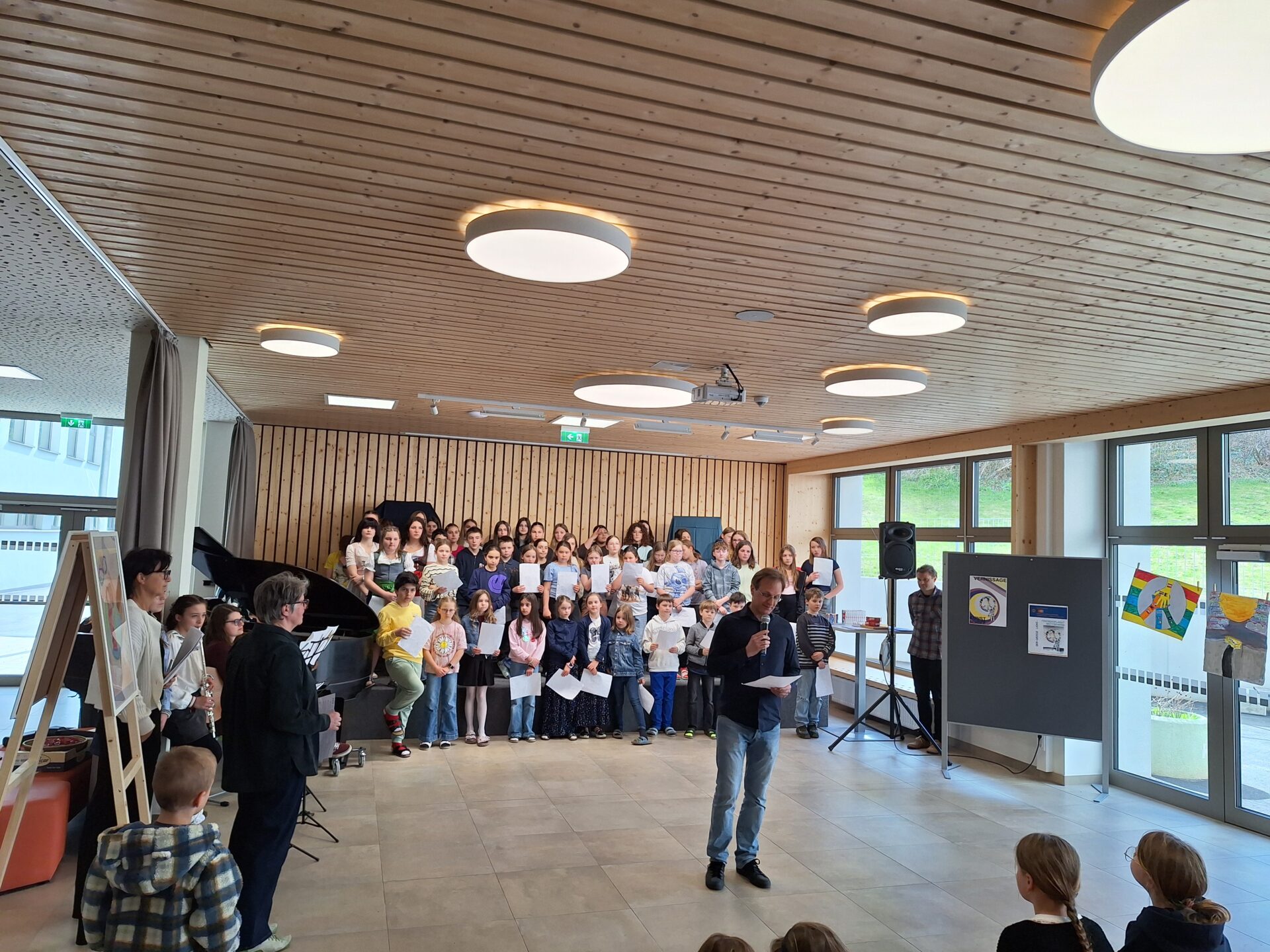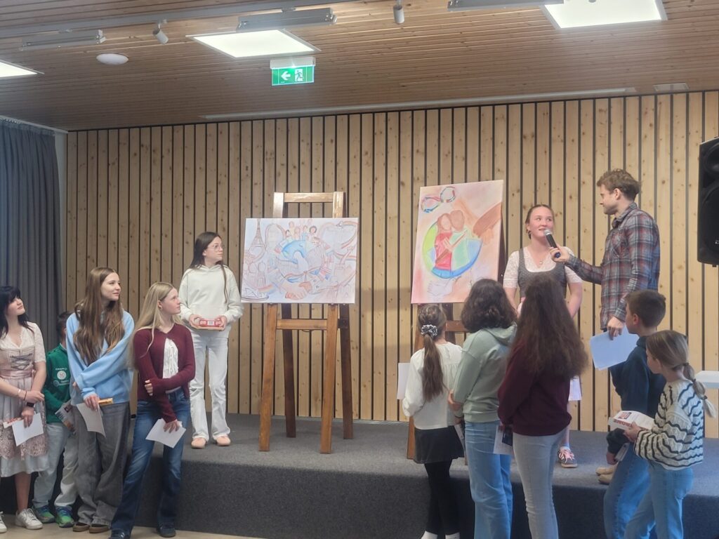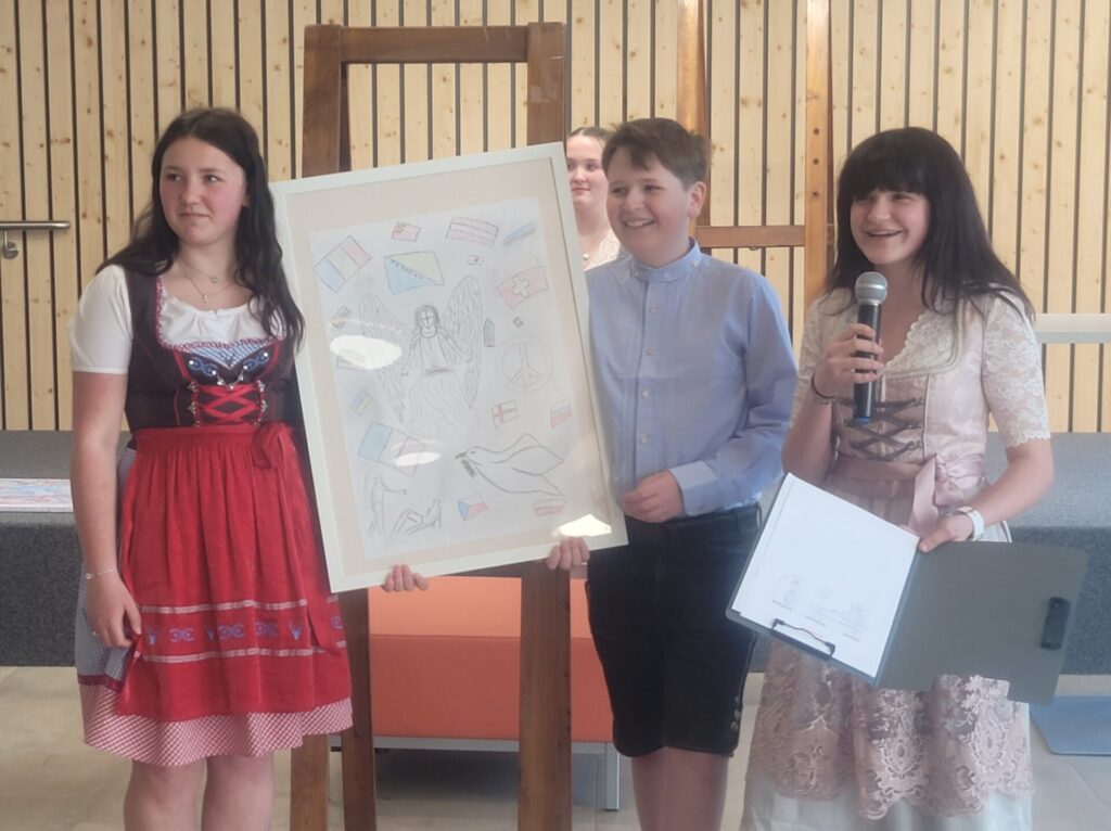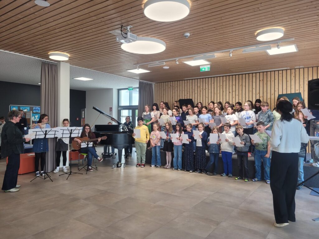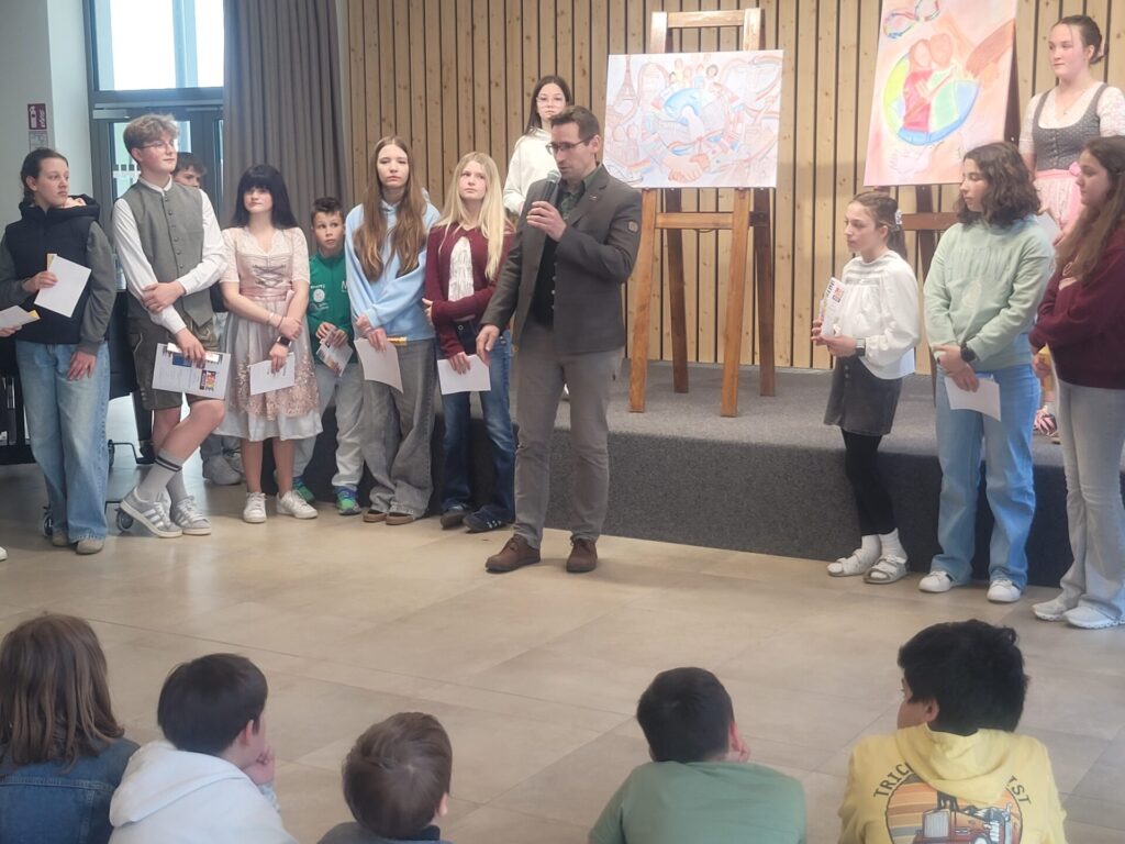 Vor der Prämierung der Zeichnungen standen eine literarische und eine musikalische Darbietung auf dem Programm. Alle lauschten aufmerksam, als Herr Kufner das Gedicht „Was keiner wagt…“ von Lothar Zenetti vortrug. Nach den Grußworten von Herrn Thym sang der Schulchor mit viel Freude und Elan „We Are the World“. Musikalisch begleitet wurden sie dabei von Frau Berger-Pichler, Frau Kraft, Frau Thym, Frau Ullreich sowie Emily Leodolter und Franziska Kroneis. Den langen, begeisterten Applaus hatten sie sich redlich verdient.