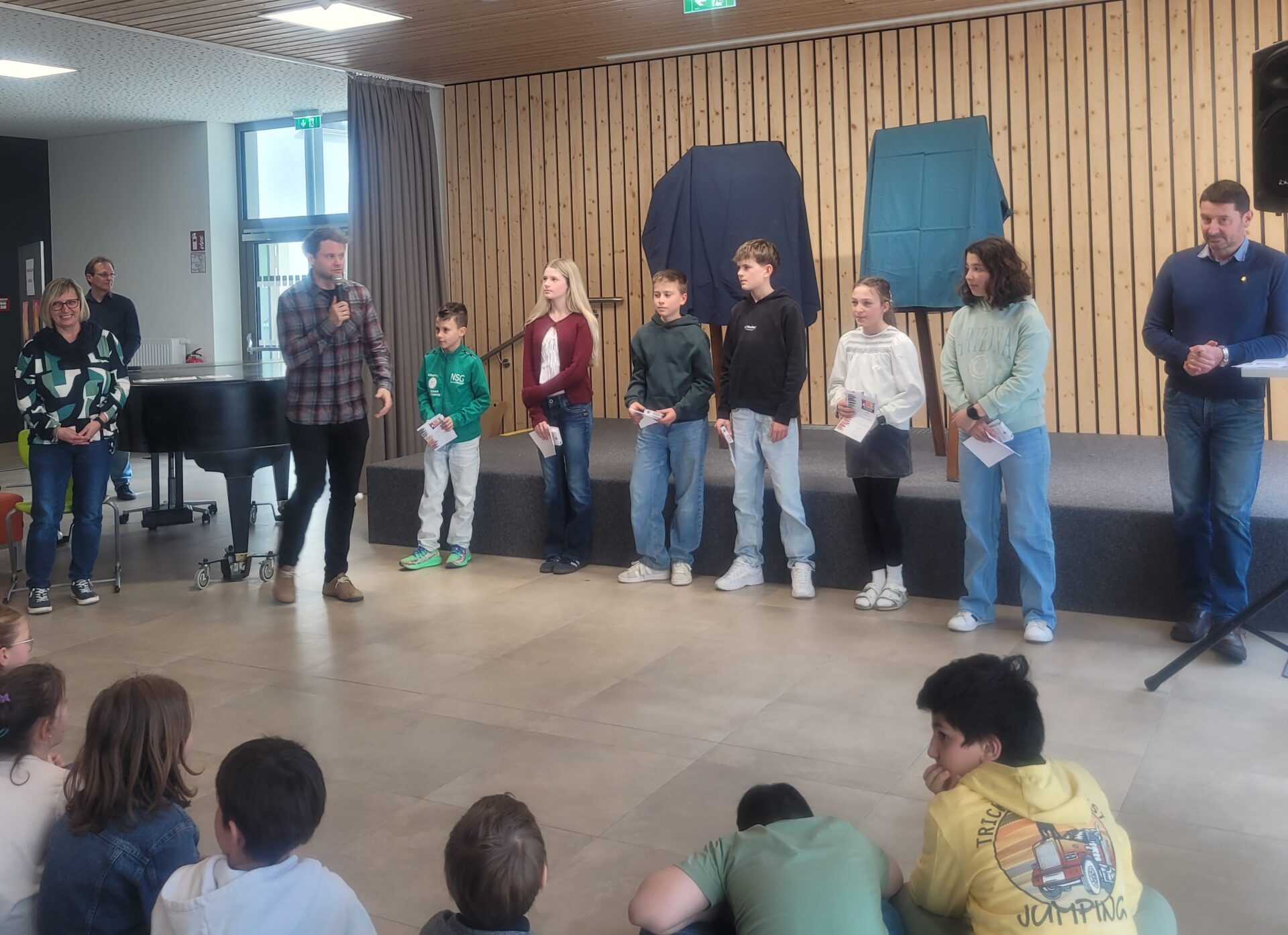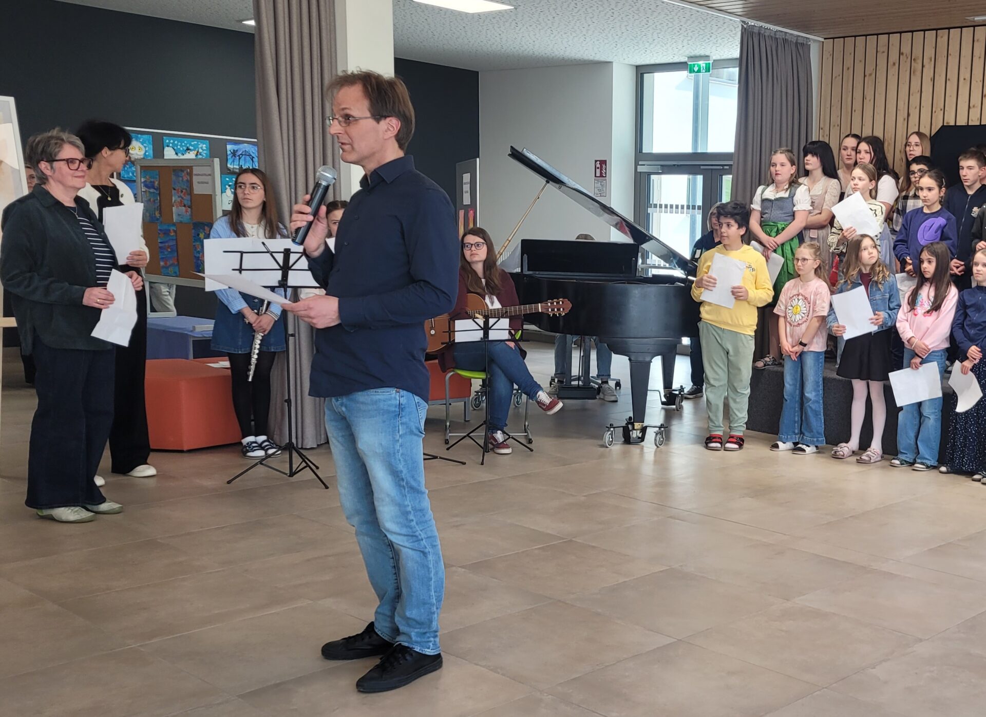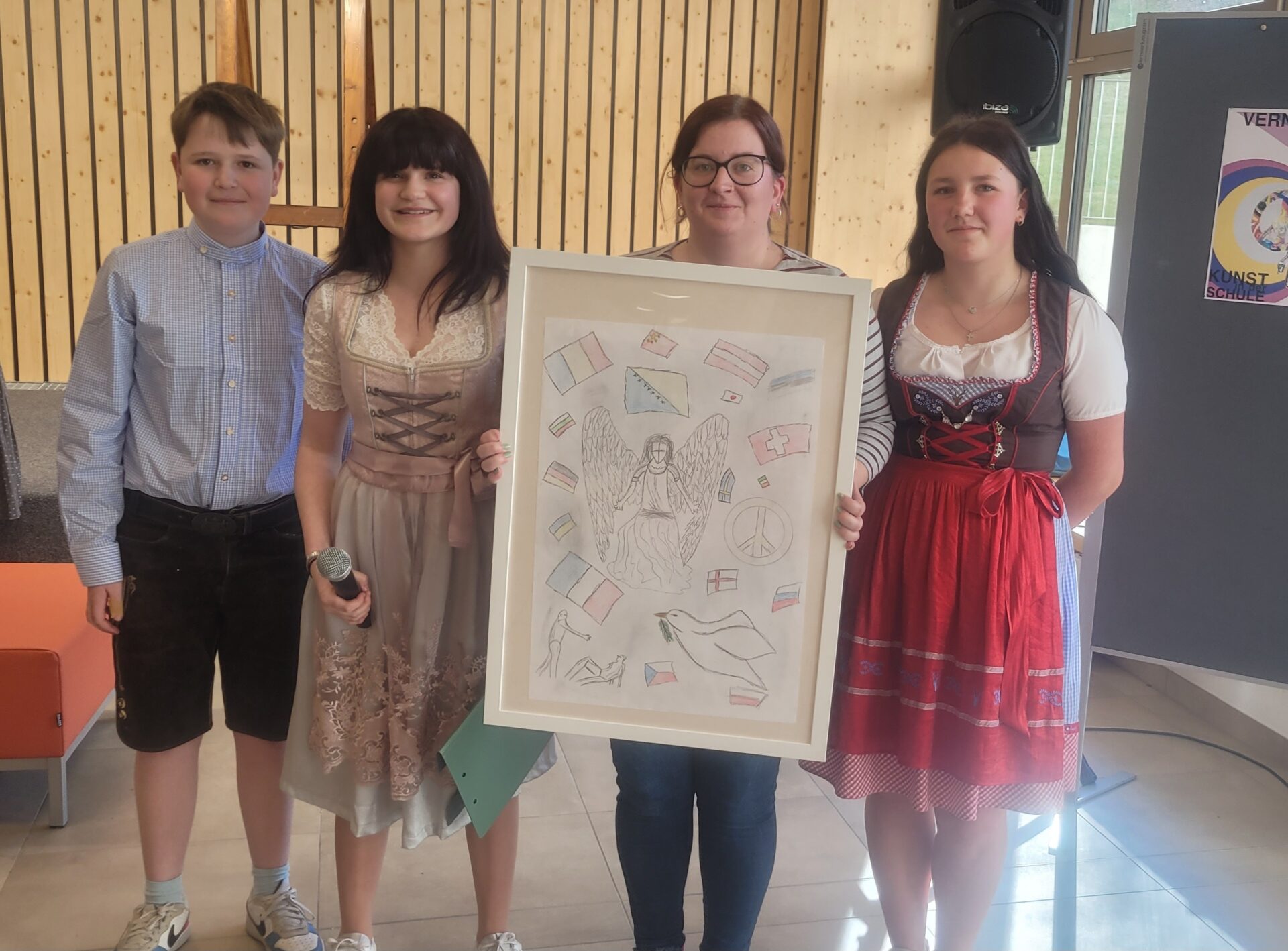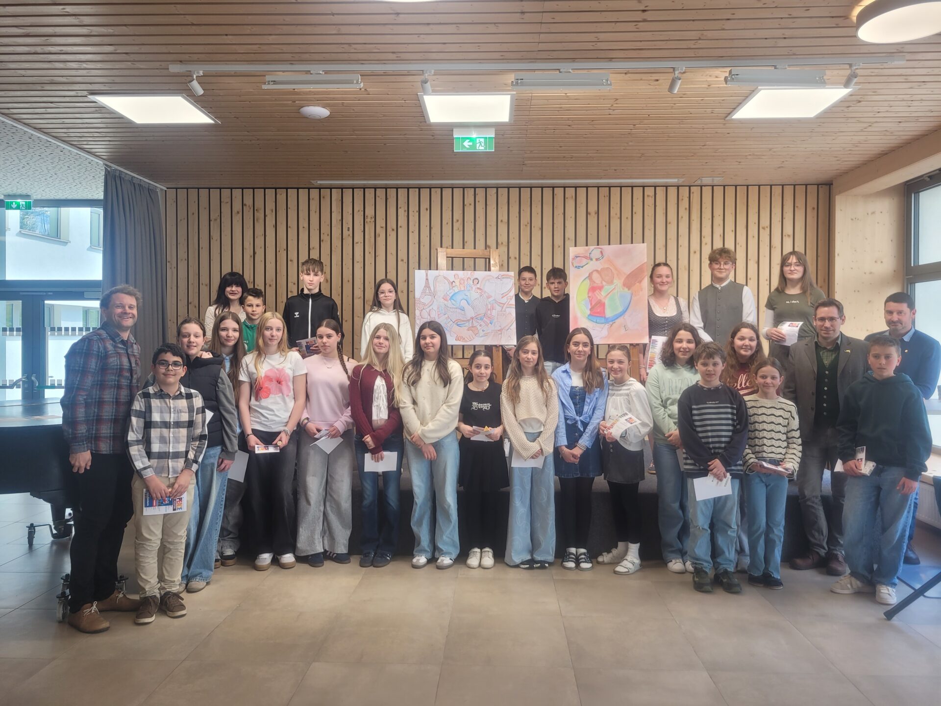 Vor der Prämierung der Zeichnungen standen eine literarische und eine musikalische Darbietung auf dem Programm. Alle lauschten aufmerksam, als Herr Kufner das Gedicht „Was keiner wagt…“ von Lothar Zenetti vortrug. Nach den Grußworten von Herrn Thym sang der Schulchor mit viel Freude und Elan „We Are the World“. Musikalisch begleitet wurden sie dabei von Frau Berger-Pichler, Frau Kraft, Frau Thym, Frau Ullreich sowie Emily Leodolter und Franziska Kroneis. Den langen, begeisterten Applaus hatten sie sich redlich verdient.