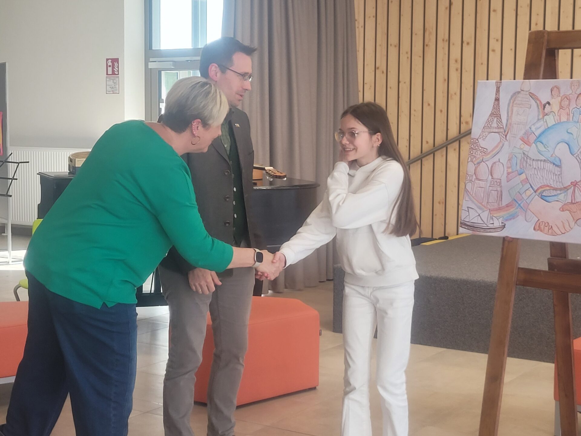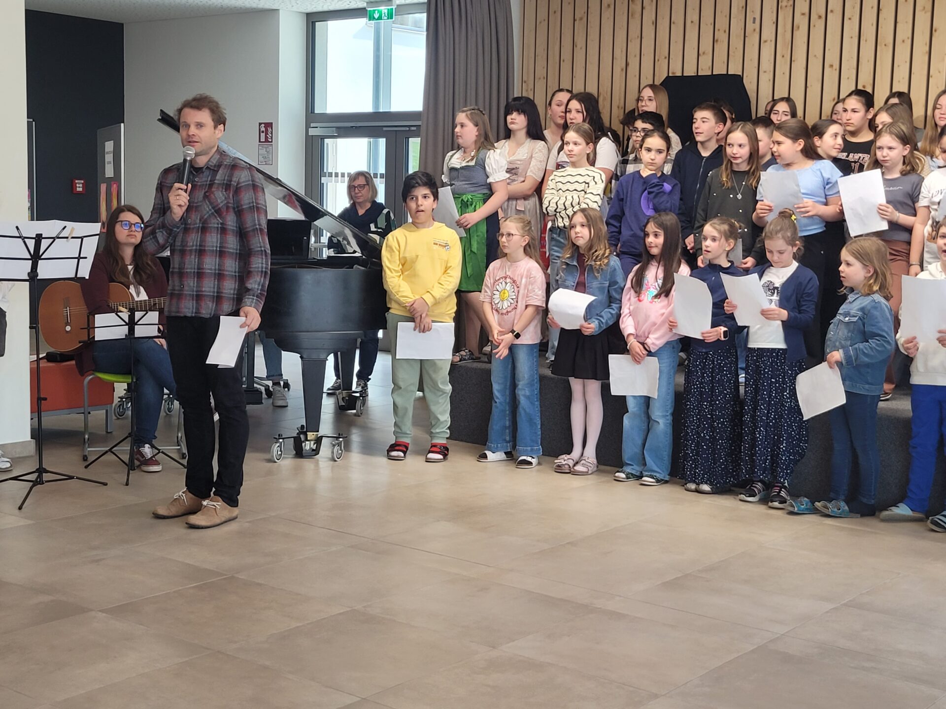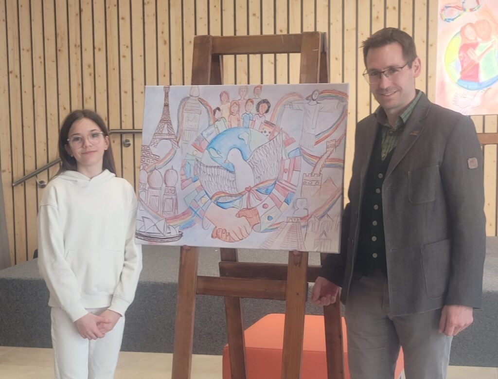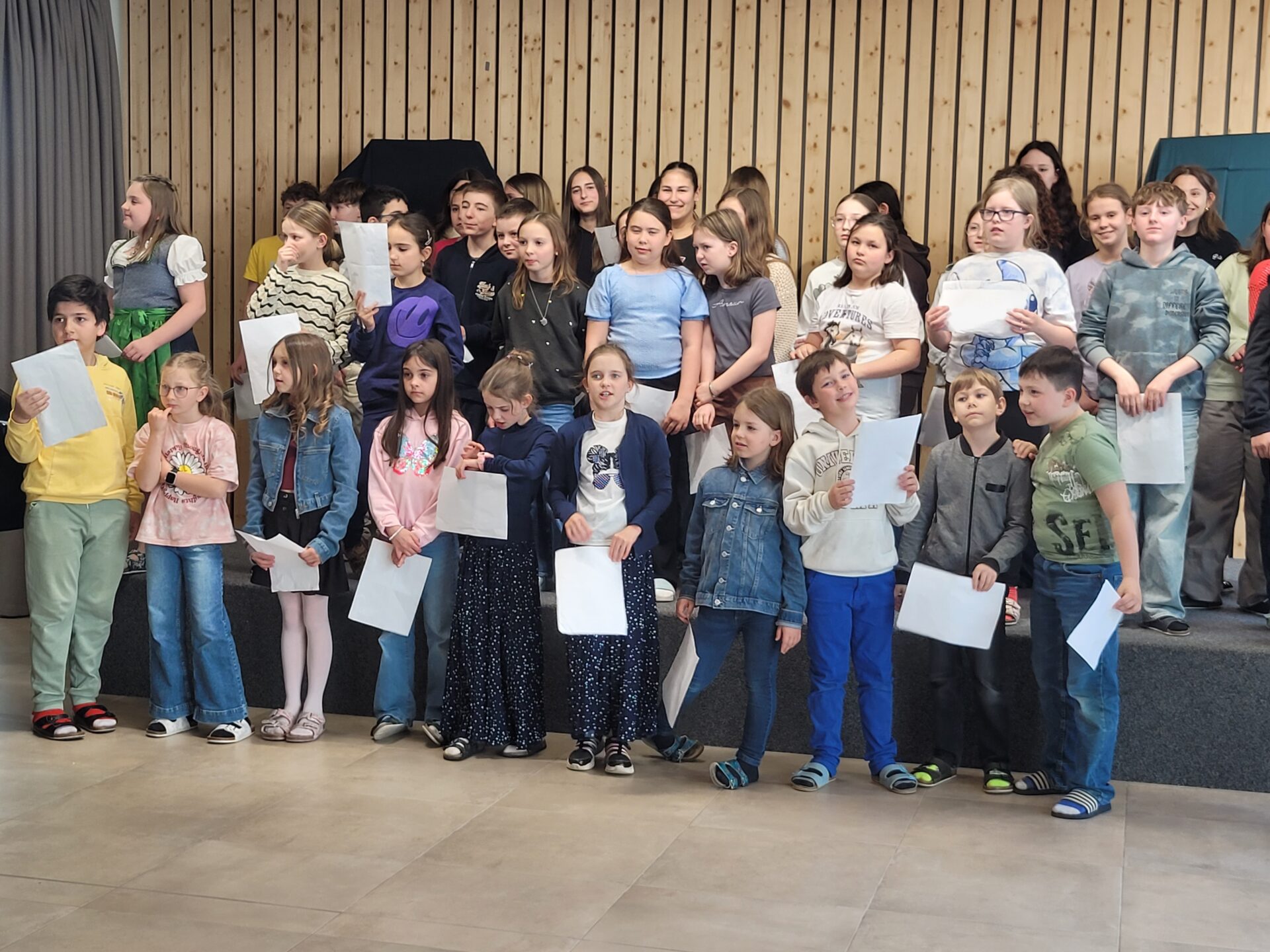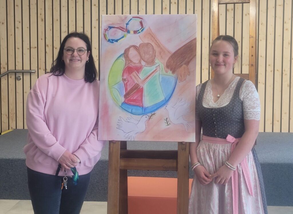 Vor der Prämierung der Zeichnungen standen eine literarische und eine musikalische Darbietung auf dem Programm. Alle lauschten aufmerksam, als Herr Kufner das Gedicht „Was keiner wagt…“ von Lothar Zenetti vortrug. Nach den Grußworten von Herrn Thym sang der Schulchor mit viel Freude und Elan „We Are the World“. Musikalisch begleitet wurden sie dabei von Frau Berger-Pichler, Frau Kraft, Frau Thym, Frau Ullreich sowie Emily Leodolter und Franziska Kroneis. Den langen, begeisterten Applaus hatten sie sich redlich verdient.