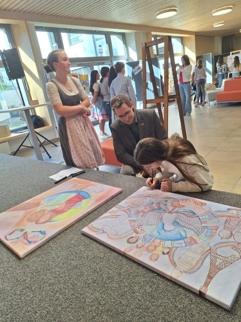 Darauf folgte das Herzstück des Nachmittags, die Prämierung der 30 Gewinnerinnen und Gewinner des Lions Club Zeichenwettbewerbs der MS und PTS. Sie erwarteten nicht nur Ruhm und Ehre, sondern auch ein Libro-Gutschein und Süßigkeiten als Lohn für ihre gelungenen Werke. Den ersten Platz teilten sich Johanna Sági aus der 3a MS und Karoline Kroneis aus der 4a MS ex aequo. Bei der anschließenden Versteigerung der beiden Siegerbilder ging es spannend zu. Schließlich gewann der frischgebackene Bürgermeister Fabian Fluch das Bieterduell um Johannas Werk. Das Bild von Karoline ersteigerte ihre Klassenvorständin Frau Petrovic.