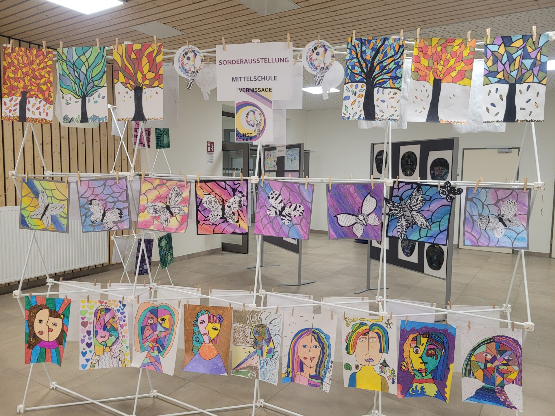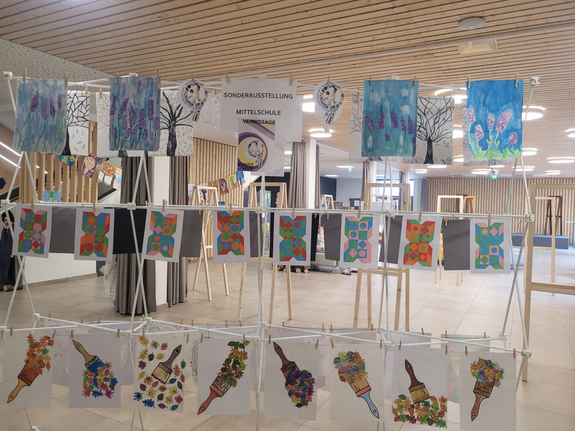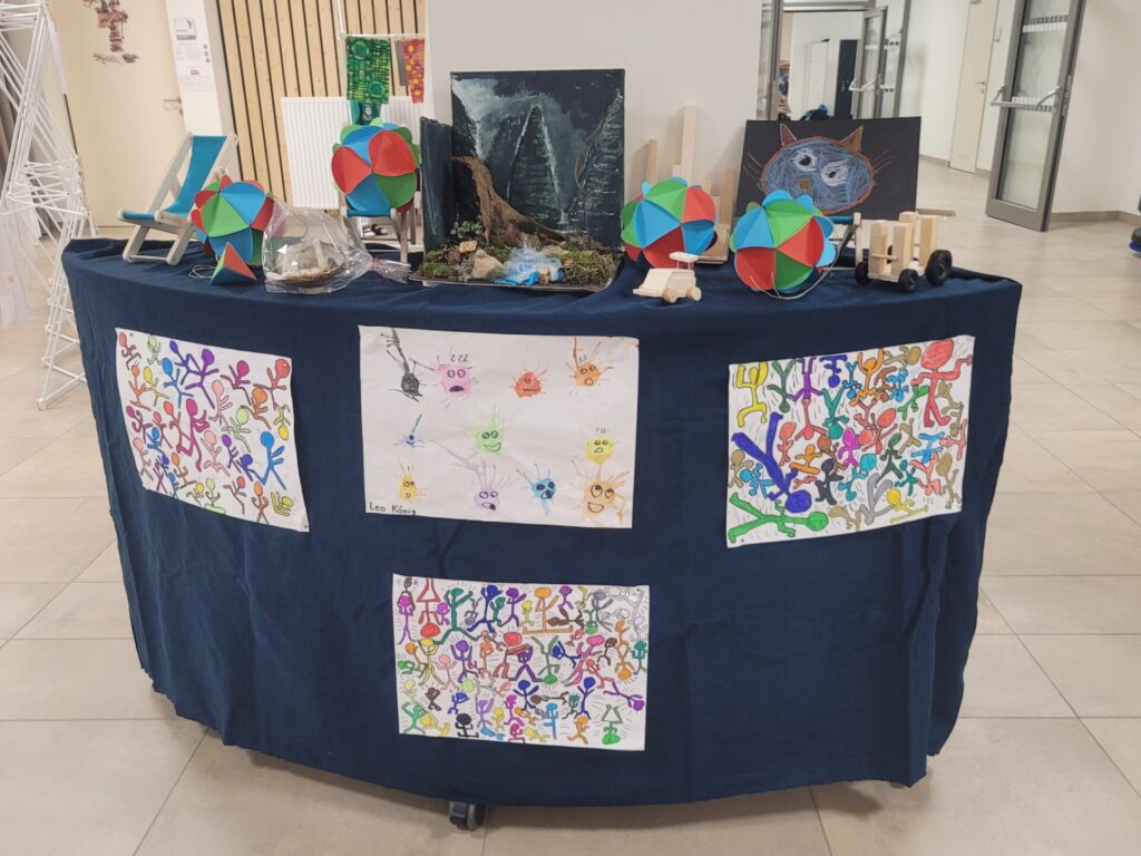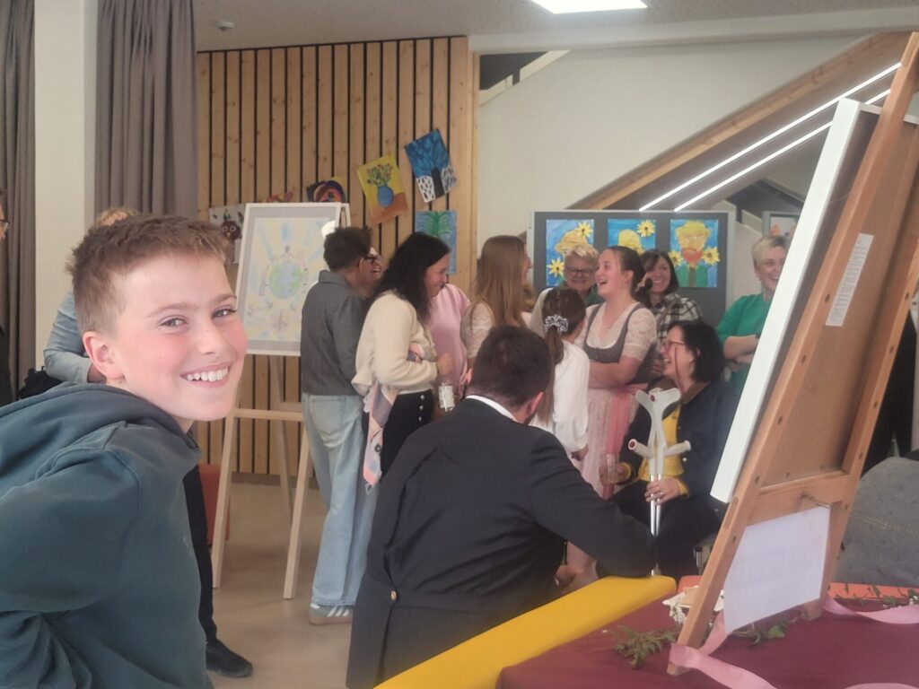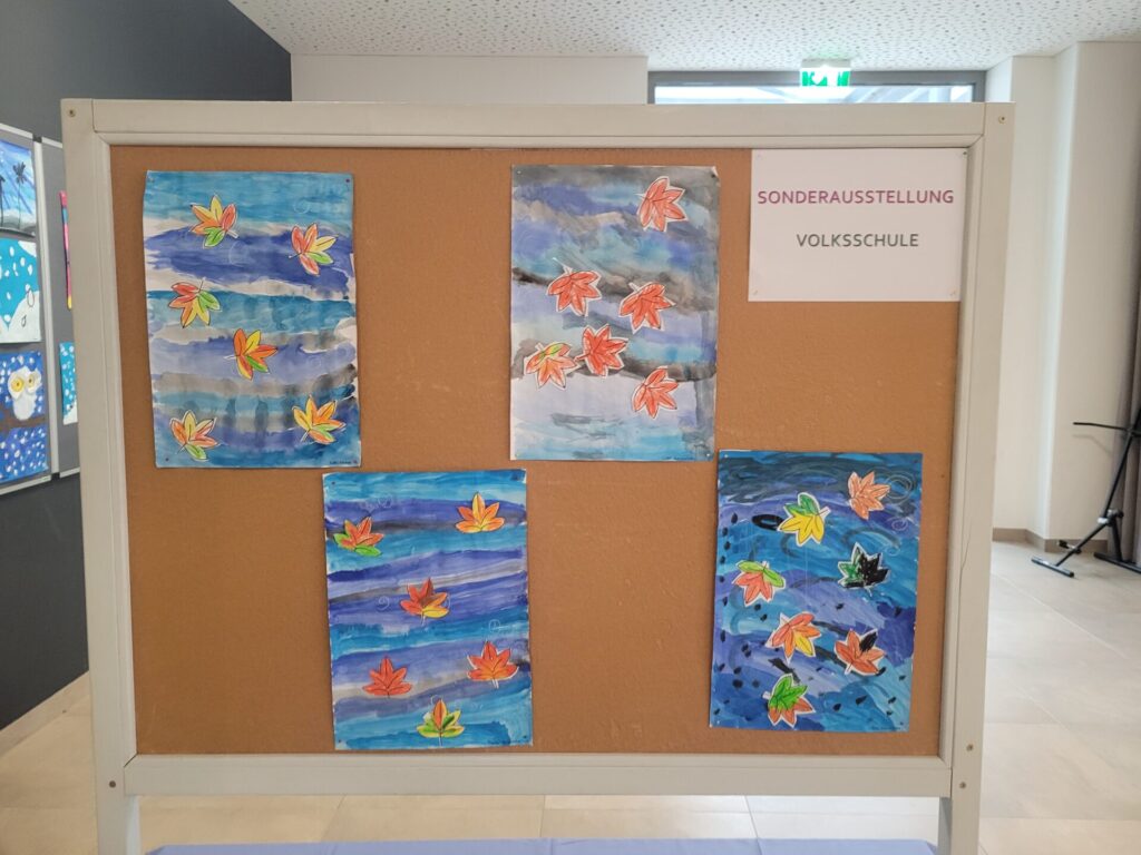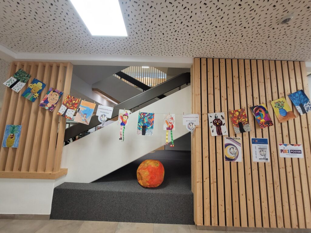 In der gesamten Aula konnte man die Kunstwerke unserer Schülerinnen und Schüler von VS, MS und PTS bewundern. Abstrakte Darstellungen, Tiere, Blumen, Gegenstände, Collagen, Comics, Werkstücke aus Holz, Tonskulpturen, eine Vielzahl an Techniken und Formaten – hier gab es viel zu sehen und zu entdecken.