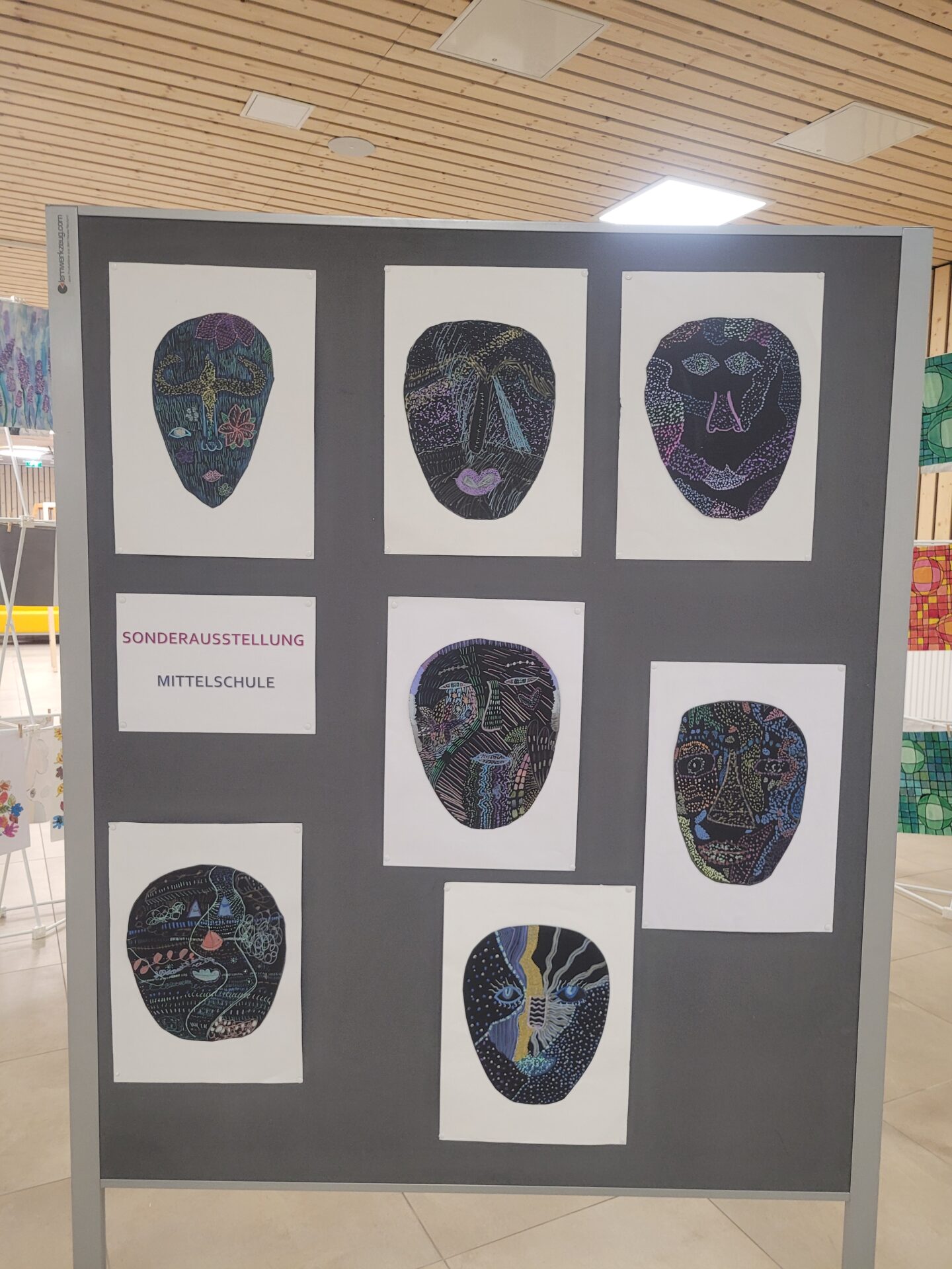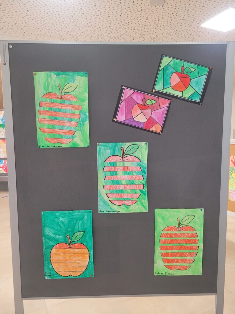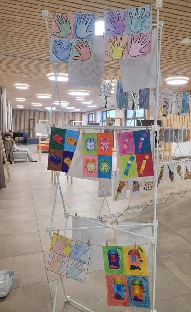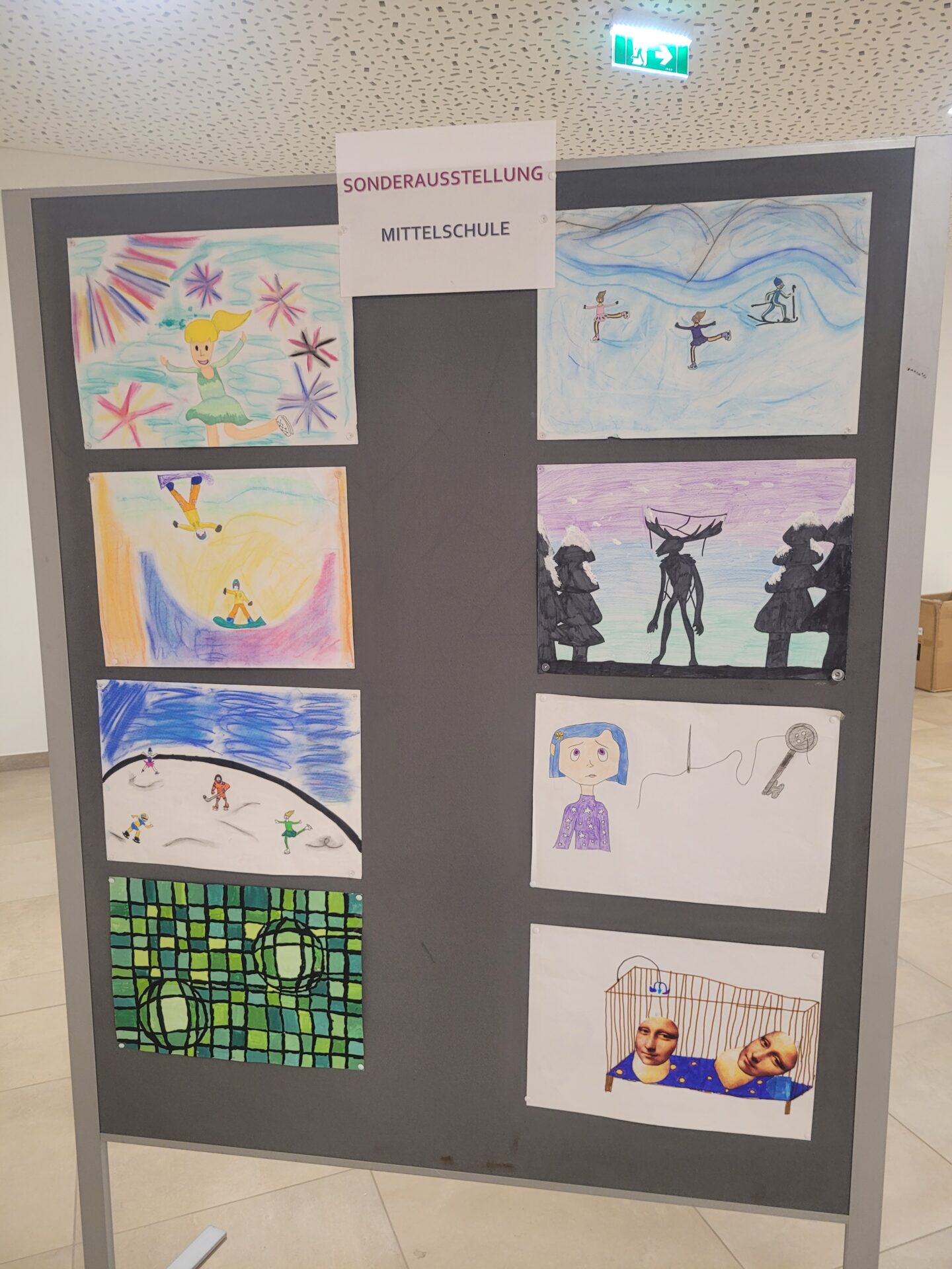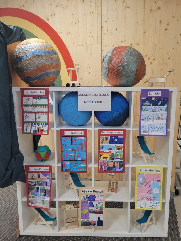 In der gesamten Aula konnte man die Kunstwerke unserer Schülerinnen und Schüler von VS, MS und PTS bewundern. Abstrakte Darstellungen, Tiere, Blumen, Gegenstände, Collagen, Comics, Werkstücke aus Holz, Tonskulpturen, eine Vielzahl an Techniken und Formaten – hier gab es viel zu sehen und zu entdecken.