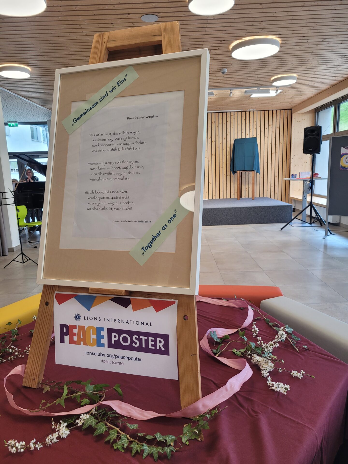 Eröffnet wurde die Veranstaltung mit einer instrumentell untermalten Lesung von einigen ausgewählten Artikeln der Menschenrechte. „Alle Menschen sind frei und gleich an Würde und Rechten geboren.“ Dieser Leitsatz unterstreicht perfekt, auf welchen Gedanken der Lions Club Friedensplakat-Wettbewerb beruht. Heuer sollten Zeichnungen zu dem Motto „Together as one – Gemeinsam sind wir Eins“ erstellt werden.