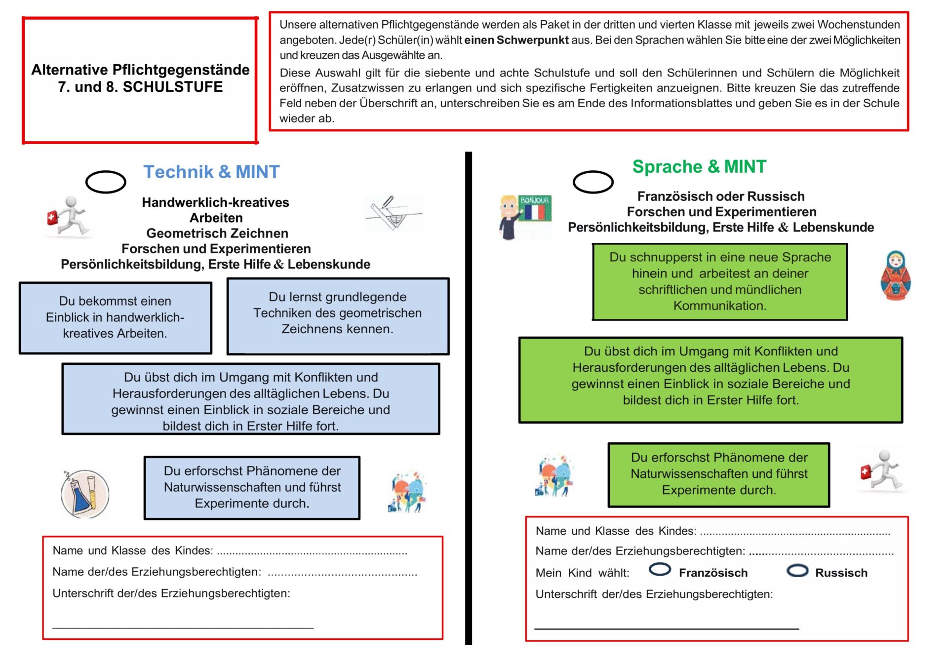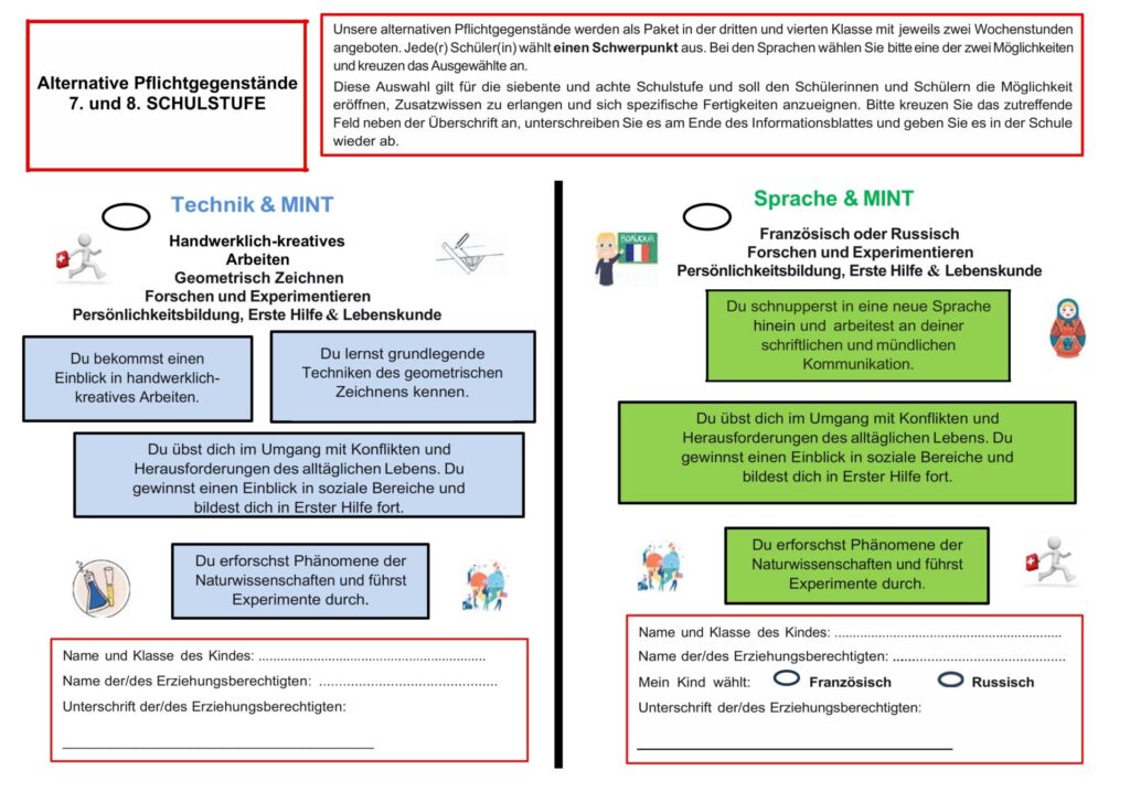 Ab der 3. Klasse Mittelschule können die Schüler:innen aus folgenden Bereichen ein Wahlpflichtfach wählen: